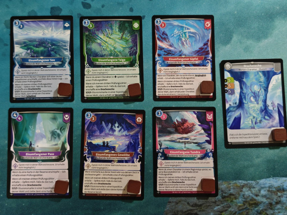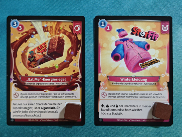 Natürlich führt das zweite Set auch jede Menge Karten ein, welche andere Karten gezielt in den erschöpften Zustand versetzen. Sogar Wahrzeichen können jetzt erschöpft werden. Und damit das Erschöpfen auch wirklich spannend wird, gibt es nun Effekte, die gezielt mit erschöpften Karten interagieren. Einige Effekte belohnen, wenn bestimmte Karten erschöpft sind, z. B.: „Wenn eine erschöpfte Karte in deiner Reserve liegt, erhält diese Expedition +1 Energie“. Andere Effekte bestrafen, wenn Karten erschöpft sind, z. B.: „Wenn ein erschöpfter Charakter in dieser Expedition liegt, verliert diese Expedition einen Aktionspunkt“.