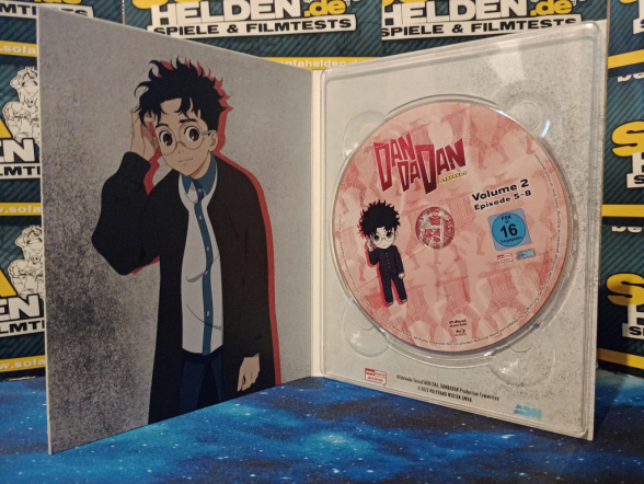 Stand Volume 1 noch ganz im Zeichen Momo Ayases, dominiert nun Ken "Okarun" Takakura die Limited Edition zur Fortsetzung. Während das Cover des Digipaks Okarun in seiner verwandelten "Turbo-Oma" Form zeigt, ist er auf der Rückseite sowie auf dem Innendruck in seiner normalen Nerd-Form zu sehen. Auf der Disc ist er dagegen im niedlichen Chibi-Stil zu bewundern. Umschlossen wird das Digipak von einer losen J-Card mit den üblichen Inhaltsangaben und Details der Volume. Während die Fanbeilagen der ersten Limited Edition sich auf die "Turbo-Oma" beschränkten, bietet Volume 2 nun insgesamt fünf Artcards mit unterschiedlichen Motiven der Figuren, ein Dan Da Dan Poster mit dem Covermotiv der Sammel-Klappbox der ersten Volume sowie einen Magnet-Sticker mit Okarun, Momo und der "Turbo-Oma".