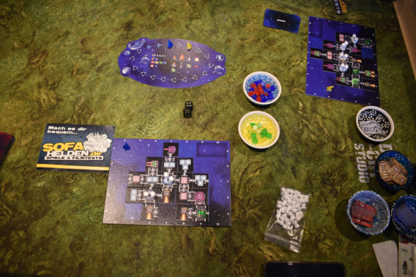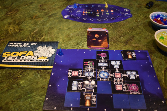 Für die erste Phase des Spieles legt Ihr die Raumschiffbauteile verdeckt in die Mitte. Parallel dazu sich alle je einen Schiffsplan und die zwei Raketenminiaturen in der gewünschten Farbe. Hinzu kommt noch eine zentrale Wohneinheit, die Ihr auf das Feld in der Mitte Eures Schiffsplanes legt. Dann kann es auch schon losgehen.