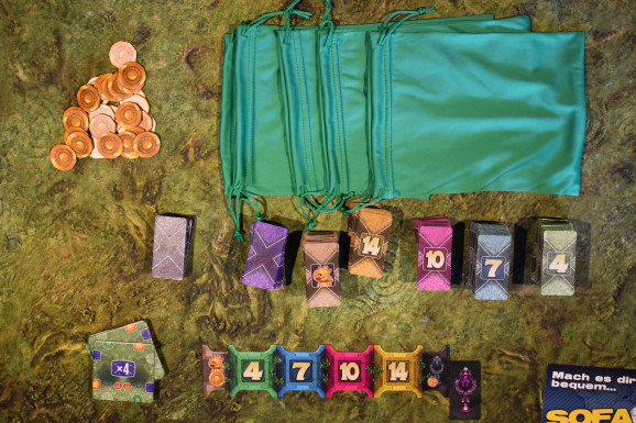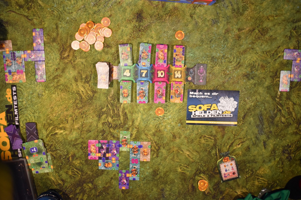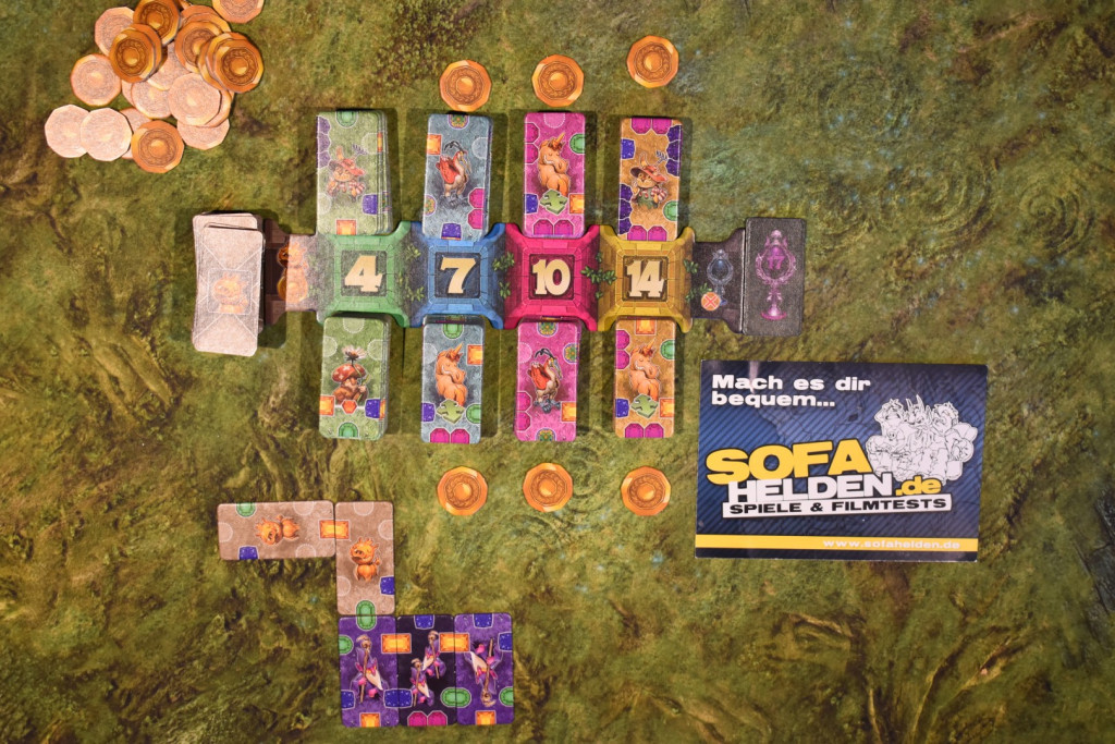 Für den Spielaufbau nehmt Ihr das Markttableau und legt es in die Tischmitte. Die Plättchen sortiert Ihr anhand Ihrer Rückseiten und mischt jeden Stapel gut durch. Anschließend teilt Ihr jeden in zwei auf und legt sie offen auf die beiden Seiten des Markttableaus mit der entsprechenden Zahl. Die Plättchen mit den Glücksschweinchen legt Ihr an das linke Ende, das Siegplättchen an das rechte Ende. Nun nehmt Ihr die Münzen und legt sie als Vorrat bereit. Sechs von Ihnen legt Ihr an jeden Stapel außer den beiden Vierern. Anschließend nehmt Ihr Euch jeweils einen Beutel und füllt ihn mit den Startplättchen auf: vier einzelne Gnome, zwei Doppelgnome und zwei Glücksschweinchen. Dann erhält die jüngste Person den Startmarker und Ihr beginnt das Spiel.