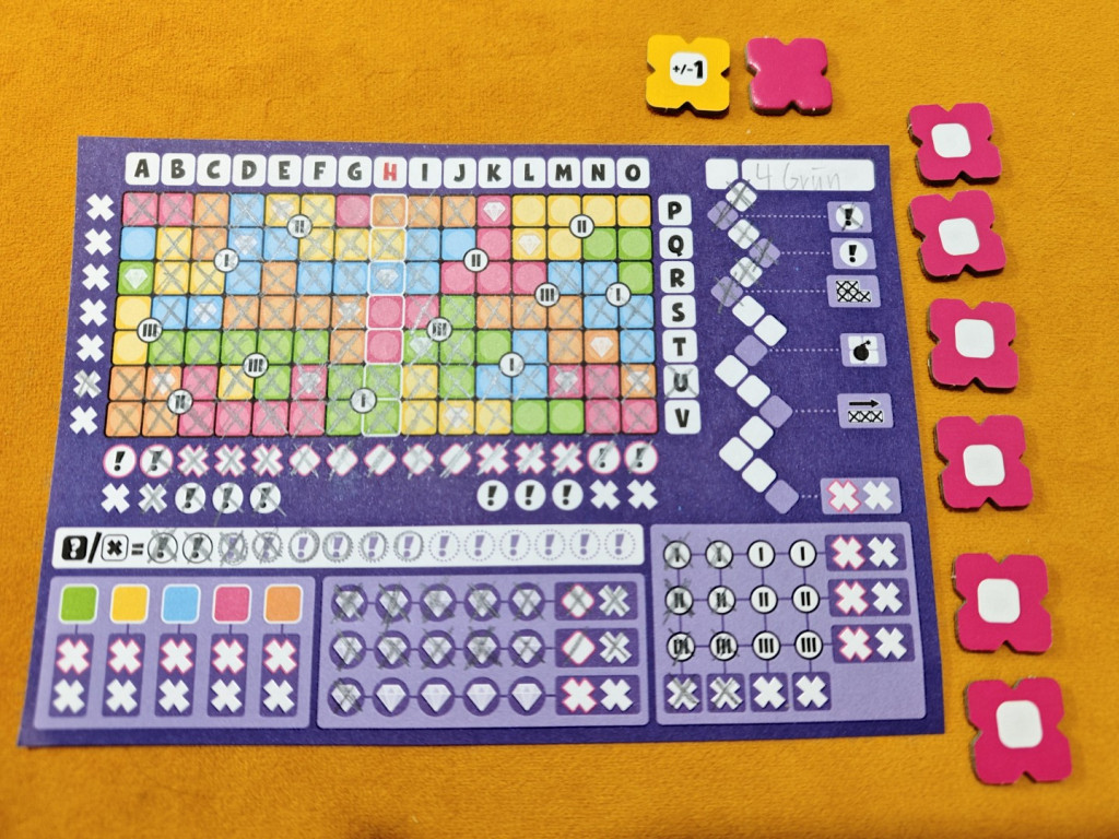 Dieses Wettrennen gibt es auch beim Erreichen von drei anderen Zielen: dem Abschließen von Farben, dem Sammeln von Diamanten und dem Werten von Kreuzungspunkten. So darf der erste Spieler, der alle Felder einer Farbe angekreuzt hat, zwei X-Chips umdrehen, alle weiteren nur einen. Zudem sind im Raster Diamanten verteilt. Immer wenn man ein Feld mit Diamanten ankreuzt, darf man auch das nächste Feld im Diamanten-Bereich auf dem Blatt markieren. Hat man eine Reihe vervollständigt – dafür braucht man jeweils fünf Diamanten – darf man einen X-Chip umdrehen; schafft man es als Erstes, gibt es einen zusätzlichen Bonus wie ein Kreuz auf der Passleiste oder einen zweiten X-Chip.