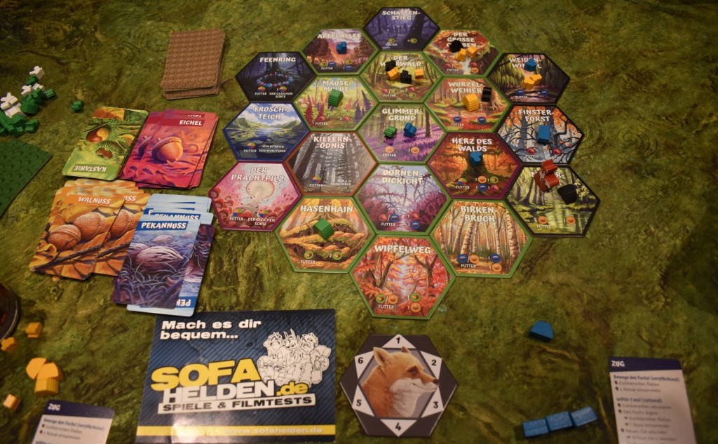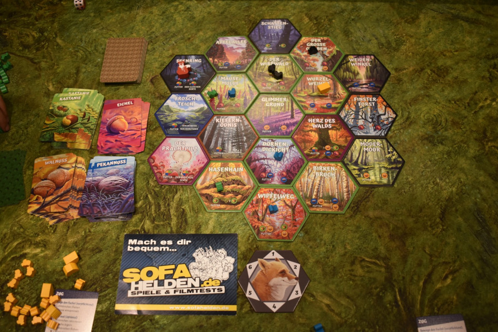 Die Fuchsbewegung ist die größte Zufallskomponente, denn Ihr würfelt mit dem Würfel und bewegt den Fuchs in die Richtung, die Euch der Fuchskompass vorgibt. Da der Fuchs der natürliche Feind der Eichhörnchen ist, fliehen diese im Anschluss von dem Feld, das er betreten hat. Dabei dürfen alle betroffenen Mitspielenden selbst entscheiden, auf welches der angrenzenden Felder die Eichhörnchen laufen. Die einzige Einschränkung ist das Feld, von dem der Fuchs kam, denn das wäre ja im Endeffekt so, als würde man ihm direkt in die Arme laufen. Außerdem gibt es noch den Froschteich, den die Eichhörnchen gar nicht betreten dürfen. Nachdem die Flucht der Eichhörnchen abgehandelt ist, darf die aktive Person Nüsse sammeln. Dies sind immer zwei Stück. Welche gesammelt werden dürfen, gibt das Feld des Fuchses vor.