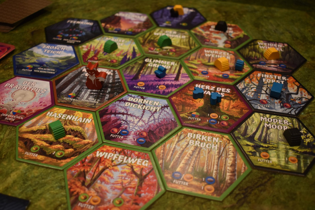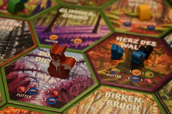 Wie man am Spielverlauf sieht, passiert vieles eher passiv durch die Fuchsbewegung. Hierzu kann auch das Bauen der Kobel gehören. Diese entstehen nämlich, sobald drei Eichhörnchen einer Farbe auf einem Feld stehen. Dabei ersetzt Ihr die drei Eichhörnchen durch einen Kobel-Spielstein. Der Bau eines Kobels führt wiederum zu einer Flucht der andersfarbigen Eichhörnchen. Später dürfen dann aber wieder alle Eichhörnchen auf dieses Feld gestellt und auch weitere Kobel gebaut werden. Doch wofür braucht Ihr die Kobel? Zum einen bringen sie Euch zwei Siegpunkte, zum anderen müssen Sie in einem Revier sein, mit dem Ihr eine Zielkarte erfüllen möchtet. Ein Revier wiederum ist eine zusammenhängende Gruppe aus Waldfeldern, die Ihr mit euren Eichhörnchen oder Kobeln besetzt habt.