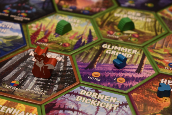 Auch wenn das Ärgern des Fuchses am attraktivsten klingt, wird die am häufigsten verwendete Aktion des Spiels das Eichhörnchen rekrutieren sein. Dabei sucht Ihr Euch ein beliebiges Feld aus, auf dem Ihr Eichhörnchen haben wollt. Ausgeschlossen ist natürlich das Feld auf dem der Fuchs steht und Felder, auf denen rechts unten keine Nüsse abgebildet sind. Denn dort wird angezeigt, wieviel Euch die Rekrutierung kostet. Ihr bezahlt die Nüsse und stellt eines Eurer Eichhörnchen auf das entsprechende Feld.