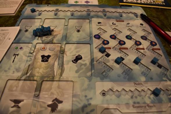 Achtung: Das uns vorliegende Spielmaterial ist ein aktueller Prototyp. Es entspricht noch nicht dem finalen Spiel und es wird noch einige Veränderungen geben. Manche, wie die Anpassung der Charakterboards, wurden uns schon mitgeteilt, andere kommen sicher noch im Nachgang. Daher ist dies ein Beta-Test. Hinzu kommt, dass das Spiel ausschließlich auf Englisch erscheint. Die Namen der Komponenten unterscheiden sich daher von unseren selbst übersetzten Varianten.