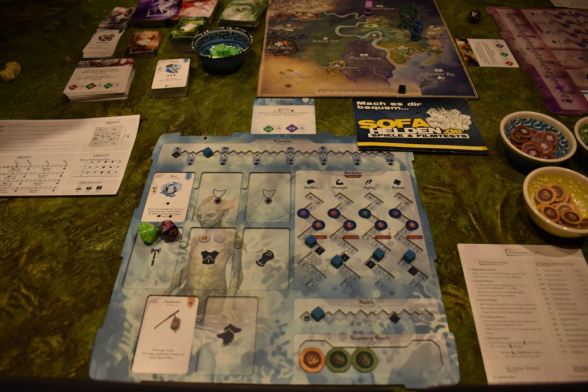 Nachdem Ihr Euren Zielort erreicht und gegebenenfalls erkundet habt, folgt der größte Teil des Spiels: Die Eventphase. Hierbei werft Ihr die beiden Eventwürfel und erhaltet so eine Zahl. Eine andere Person nimmt das Abenteuerbuch und sucht die Kombination aus Gebiet und dieser Zahl heraus. Manche Events bringen Euch „nur“ etwas Geschichte, andere bringen Euch Vorteile in Eurer Reise in Form von Ressourcen, Ruf oder Erfahrung und wiederum andere führen in einen Kampf. Manchmal müsst Ihr würfeln, um zu sehen was passiert. Das könnt Ihr aber durch Eure Attribute beeinflussen und manchmal dürft Ihr Euch auch entscheiden, was ihr macht. Kommt es zu einem Kampf, werden das Abenteuerbuch offen ausgelegt und die Würfel auf den Lebenspunkten der Gegner platziert. Dann würfelt Ihr gleichzeitig und macht Euch so durch die Kombination aus Würfelergebnis und Fertigkeiten, gegenseitig Schaden. Dieses Prinzip ist sehr interessant, weil Ihr eben nicht möglichst hoch würfeln müsst, sondern die Ergebnisse, die Eure Fertigkeitskarten vorgeben. Außerdem hat jeder Charakter die Möglichkeit die eigenen Würfelergebnisse und die des Monsters zu beeinflussen. Entweder durch neuwürfeln oder addieren/subtrahieren bestimmter Werte.
