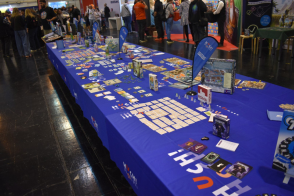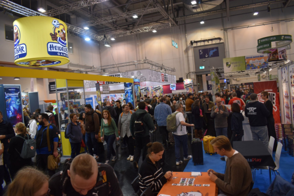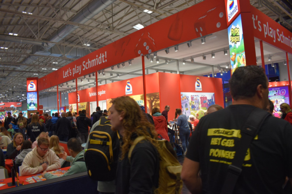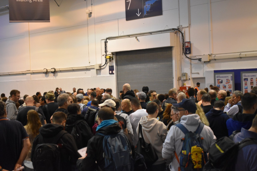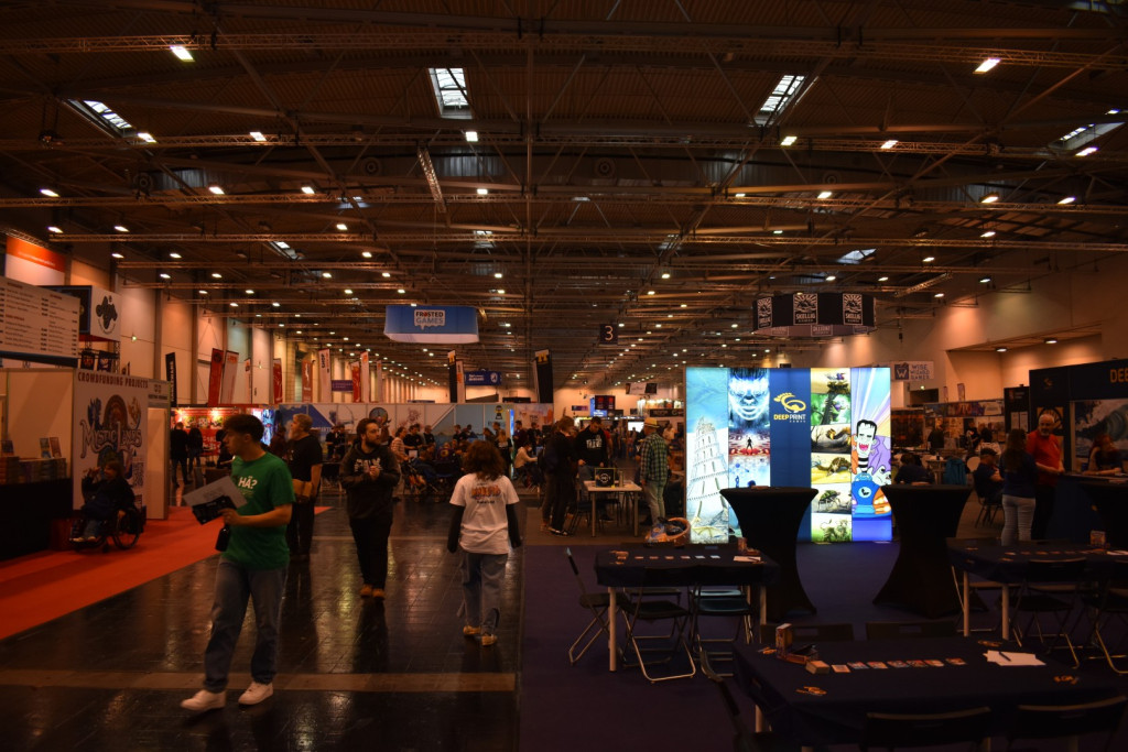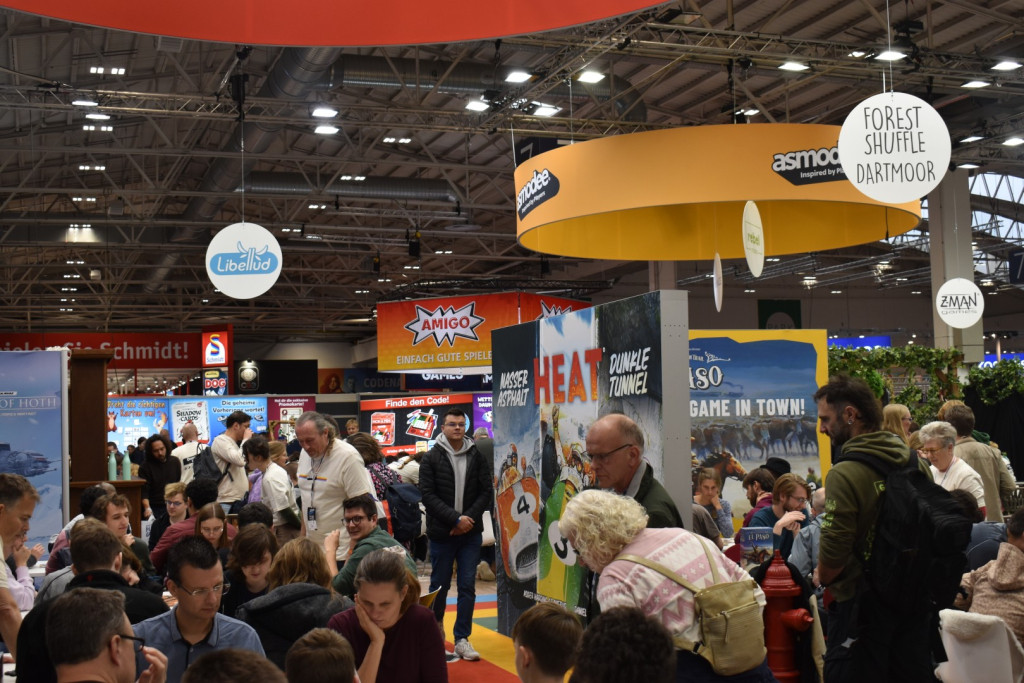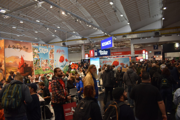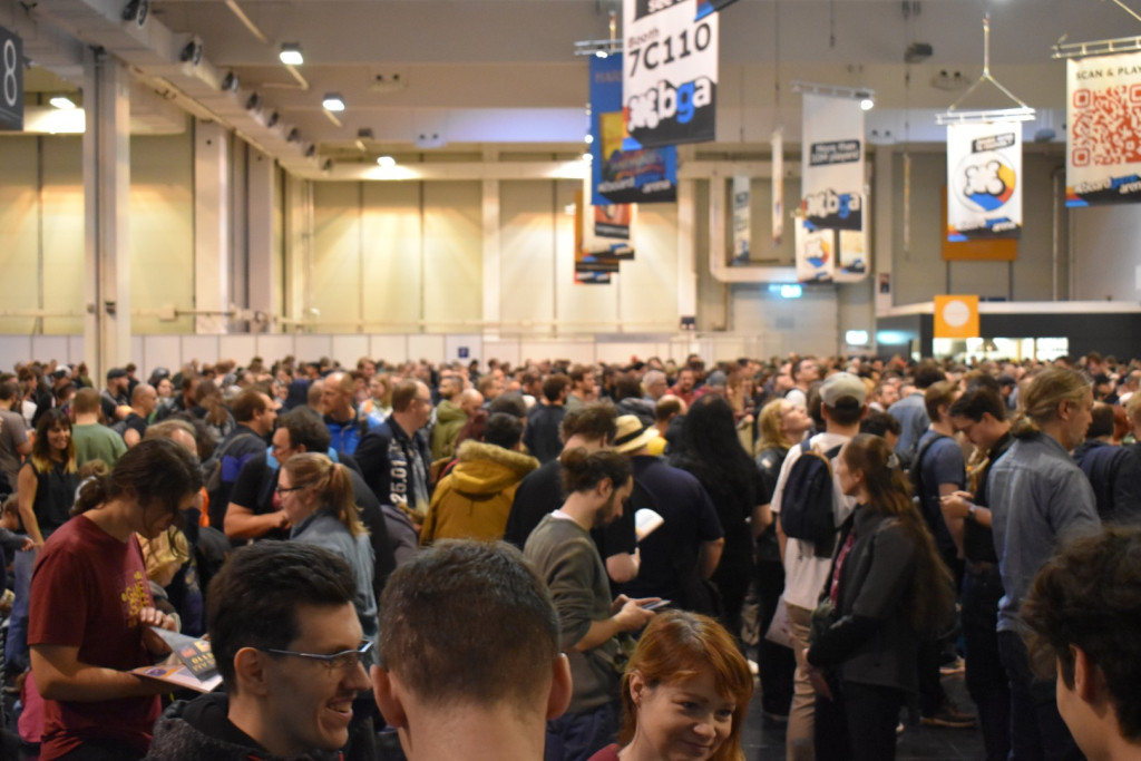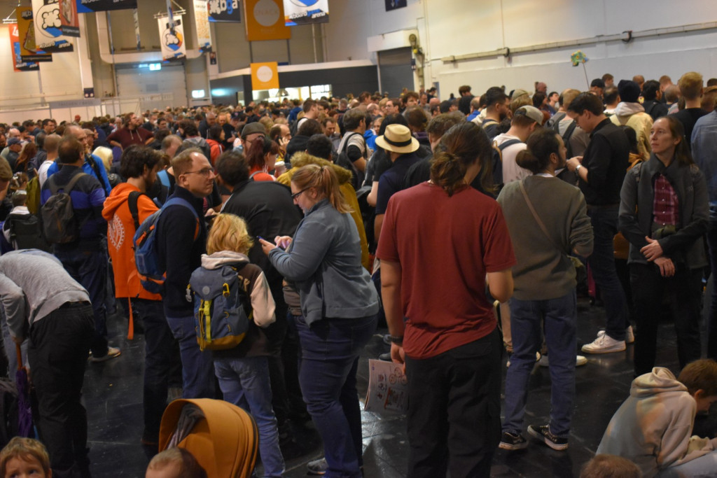 Mittlerweile ist es eine gute Stunde später und wir schlendern in Richtung Halle 3, denn hier steht ein Presseevent an. Wir schnuppern kurz rein, bevor wir in weitere Termine gehen und dabei feststellen: Der Unterschied zwischen Halle 6/7 (Familienspiele) und Halle 3 (Expertenspiele) ist gigantisch. Während man in den ersten Hallen relativ gut laufen kann, muss man in Halle 3 einen auf Lightning McQueen in der Traktorszene machen: Lücke suchen und mit Vollgas drauf zusteuern oder sich in der Masse treiben lassen. Mittlerweile hat sich der erste Eindruck etwas gewandelt: Man realisiert, wie groß die Messe ist und wie viele Leute die angestrebten 220000 Messebesucher*innen in 4 Tagen eigentlich sind. Trotzdem sind wir dazu gekommen noch einige gute Gespräche mit Verlagen zu führen und uns dort Spiele zeigen zu lassen.
