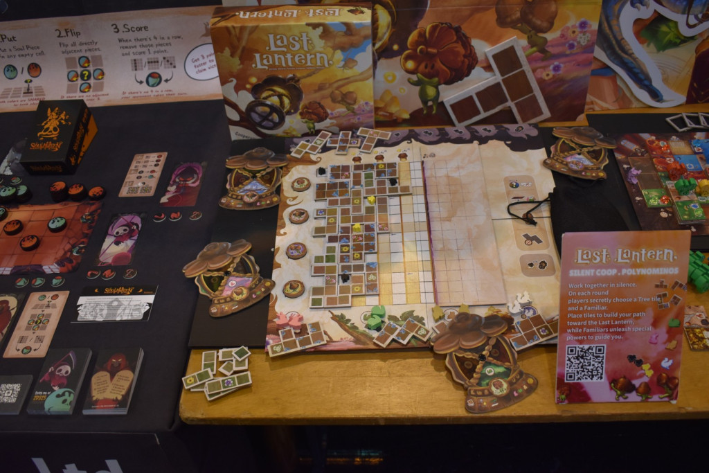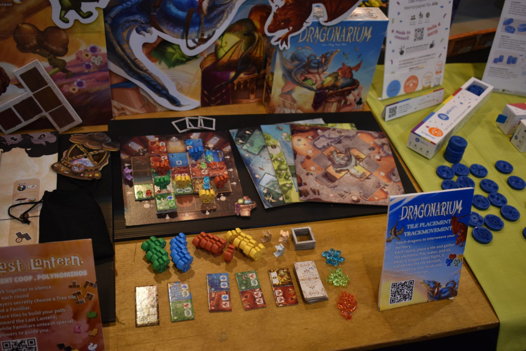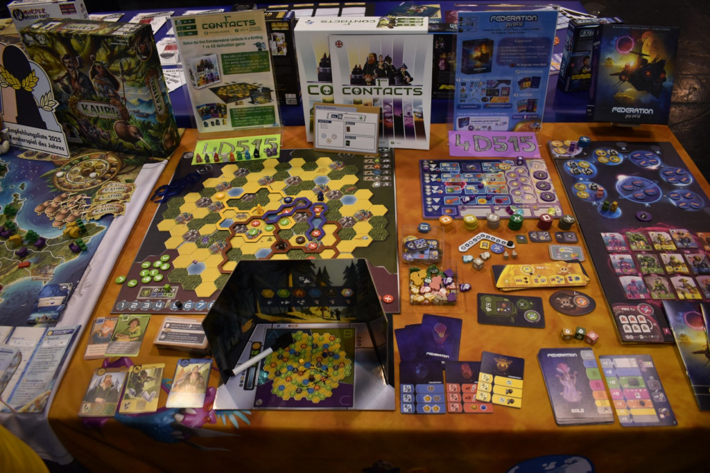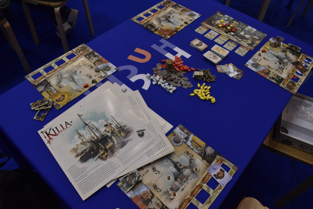 Bereits vorgewarnt durch diverse Messebesucher wollen wir natürlich am ersten Tag nicht zu spät kommen. Unsere überraschend leere U-Bahn bringt uns wieder zum Eingang Ost. Dieses Mal aber mit einem völlig anderen Bild. Der Eingang zur Messe ist um 9 bereits offen und die Spieler*innen versammeln sich bereits in Halle 8 (quasi die Eingangshalle), in sehnsüchtiger Vorfreude auf die Messe vor den verschlossenen Toren zu Halle 7. In dem Moment sehr dankbar über die Akkreditierung, suchen wir den Presseeingang. Hier herrscht ein wenig Verwirrung, wo dieser eigentlich ist oder ob man vielleicht doch beim Kosmos Shop ansteht? Am Ende geht alles gut und wir kommen in Halle 7. Der erste Eindruck: Ok, eine Messehalle mit vielen Spielen. Es sind zwar schon einige Austeller*innen und Pressevertreter*innen in den Hallen unterwegs, aber sonst ist es Menschenleer… Die Ruhe vor dem Sturm. Wir verschaffen uns einen ersten Einblick und starten den Messetag um 10:00 in Halle 6 mit einem ersten Spiel: Kilia, das uns erstmal nur wegen des besetzten Tisches von Serverton als „Notnagel“ ins Auge sticht. Aber siehe da: Ein sehr gutes Spiel.
