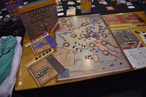 Tag zwei startete ich alleine, da Josi sich leider erkältet hatte. Ich begab mich an den Westeingang der Messe, da wir Herr der Ringe - Das Schicksal der Gefährten spielen wollten. Während ich mit den anderen Pressevertretern leider in der Kälte warten musste, fiel mir auf: falscher Eingang, wir müssen eigentlich laut App Halle 1 oder Halle 7 (anderes Ende der Messe). Letzteres war also etwas weit weg. Ich versuchte es demnach erst einmal in Halle 1. Dort sagte man mir aber, dass das Spiel nur in Halle 7 spielbar ist. Das kam aber nicht in Frage, also rannte ich erst einmal verwirrt in Halle 3 umher und war mir nicht sicher: Was möchte ich spielen? Ich war ein wenig überfordert und landete schlussendlich bei Deep Print Games und spielte mit Alex von Brettspielwelt Skybridge. Das eigentlich auf der Wunschliste eines Freundes stand, uns aber vollkommen überzeugte. Später stieß dann noch Josi zu uns und wir spielten Insurrection von La Boîte de Jeu als Lückenfüller. Den übrigen Tag versuchten wir noch etwas zu finden, aber es blieb beim gemütlichen Messeschlendern und vielen Gesprächen.