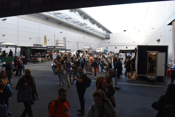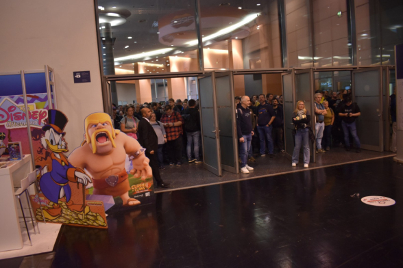 Angereist sind wir - auf Grund des langen Weges - bereits am Dienstag, um Mittwoch - viel zu früh - vor den Messehallen zu stehen. Also starten wir den Tag erst einmal mit einem Kaffee, was sich bei geschlossener Messe als etwas schwierig gestaltet. Irgendwie sind wir voller Vorfreude und Spannung, was gleich passieren wird. Man kennt das Ganze zwar schon aus dem Livestream, aber real ist es dann doch etwas anderes. Nachdem das Foyer geöffnet wurde und wir uns umsehen, sieht man lauter bekannte Gesichter. So natürlich auch BrettMan und nerdstar vom SPIEL Livestream.
