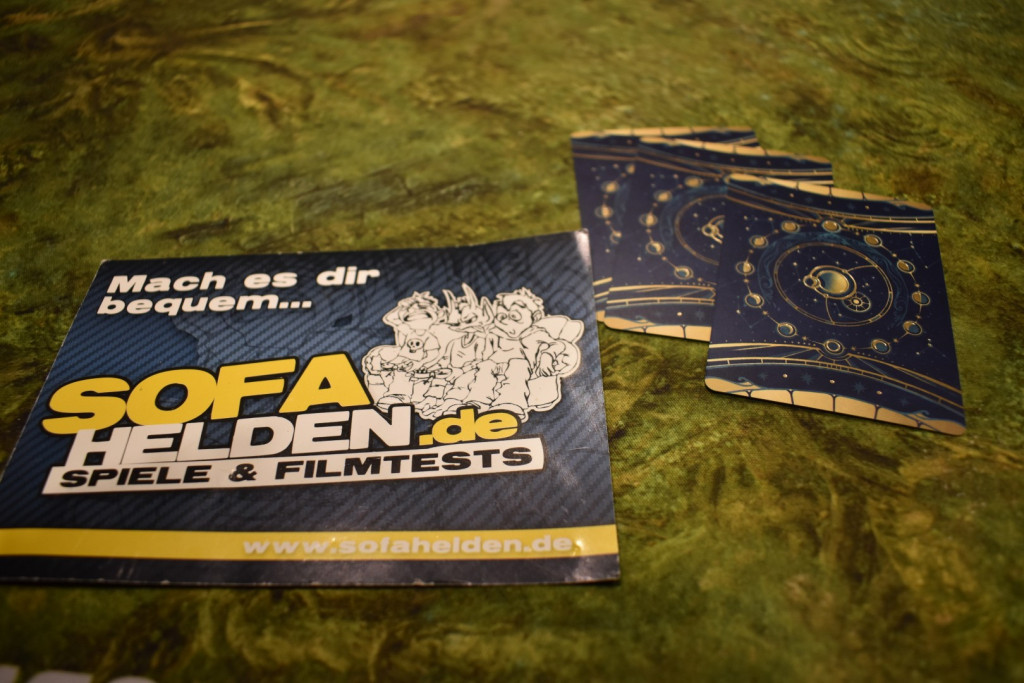 Das Spielmaterial zu Take Time ist relativ übersichtlich: Zwölf mysteriöse Umschläge mit schönem Uhr-Artwork, ein Stanzbogen und ein Papierumschlag mit Karten. Zu Beginn kann man zum Spielmaterial noch nicht so viel sagen. Die Marker des Stanzbogens sind eher schlicht, die Artworks der Uhrenumschläge wunderschön. Die Karten - eine Augenweide. Leider erkennt man es auf den Fotos nicht so richtig, sie sind alle auf den Rückseiten mit einem 3D-Effekt versehen. Ihr könnt die aufgedruckten Mondphasen und die Sonne also nicht nur durch die reflektierende Goldfarbe sehen, sondern auch ertasten. Dagegen wirken die Uhren schon fast trist. Sie sind vom Material her eher dünn, aber das ist ok. Dafür sind sie aber optisch sehr ansprechend.