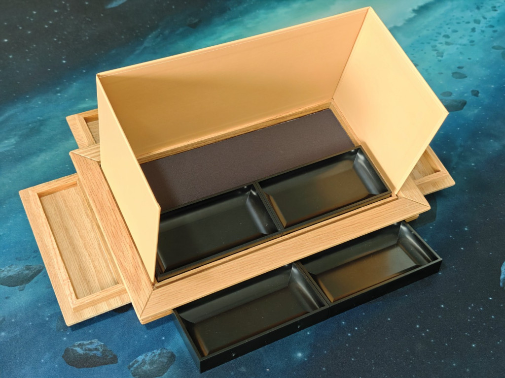 Die Verarbeitung des Tisches ist super, wir sind wirklich überrascht. Gerade in so einem kleinen Format Holz so passgenau zu bearbeiten, kann nicht einfach gewesen sein. Es handelt sich ja auch nicht um einen simplen Tisch. Vier herausnehmbare Tischplatten liegen passgenau auf einer inneren Leiste auf, die selbst auch eine Einkerbung hat. Der Tisch hat zudem auch außen eine Einkerbung zum Einhängen von Zubehör. Und tatsächlich lassen sich die vier Tischplatten umdrehen und dort einhängen, wo sie als Trays für z.B. Tokens oder Münzen fungieren können. Nun sind wir schon bei den Funktionen.