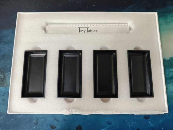 Die möglichen Verwendungen für den Tiny Table sind richtig vielseitig. Unsere Intension war den Tisch für Auslagen bzw. Spielmaterial zu verwenden, an das alle Spieler rankommen müssen. Den Tisch kann man gut weiterreichen. Außerdem kann man auch darunter Dinge platzieren, sodass man netto Platz spart. Nachdem wir aber das ganze Zubehör gesehen haben und auch etwas recherchiert, hat sich zunächst ein Moment der Überforderung eingestellt. So viele Möglichkeiten. Also wo fangen wir an?