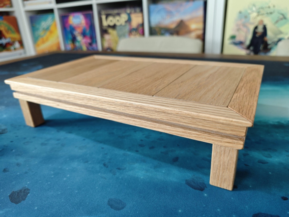 Und wie wäre es mit einem Tisch pro Spieler? Der Tisch kann auch hervorragend als Spieler-Tableau zur Organisation des persönlichen Spielermaterials verwendet werden. Ok, zugegeben, es wäre schon etwas dekadent vier oder fünf dieser Tische zu besorgen, um die gesamte Spielrunde zu versorgen. Oder vielleicht doch nicht? Wir wollen hier niemanden verurteilen! Drücken wir es so aus: für Solo-Spieler ist die Verwendung als Spieler-Tableau definitiv eine Option. Hier liefert die innere Leiste des Tisches zum Beispiel die Möglichkeit Karten aufzustellen: etwas versetzt passt eine Hand aus 5 Karten entlang der langen Seite des Tisches. Aber es lassen sich natürlich alle vier Seiten verwenden! Und die Karten-Rails sind sogar zugänglich, wenn die Spielfläche abgedeckt ist. Außerdem ist sie breit und tief genug, um auch Plättchen oder dickere Tableaus einzuhängen.