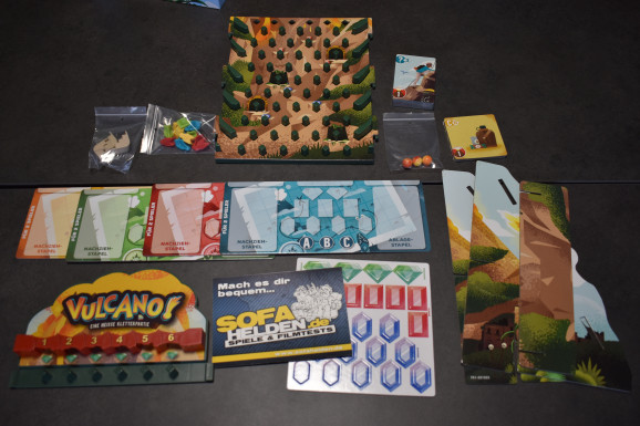 Bereits auf der Spielwarenmesse 2025 in Nürnberg sprach uns das Spiel mit seinem auffälligen Aufbau an. Der Vulkan wird aus zwei Kunststoffelementen zusammengesteckt. Beide sind mit Kartoneinlagen versehen, die den Berg grafisch dazu machen. Am Gipfel befinden sich sechs Einwürfe für die Lavakugeln. Außerdem ist der komplette Berg mit „Nubsis“ versehen, die zur Lenkung der Kugeln und als Abstellfläche für die Figuren dienen. Damit der Vulkan auch ordentlich steht, gibt es noch drei weitere Kartonelemente, mit deren Hilfe man das Ganze in der Schachtel aufbauen kann. Somit können dann auch die Lavakugeln nicht wegrollen. Hinzu kommen vier Spielerbögen, zwei eingeschweißte Kartenstapel sowie drei Zippbeutel mit Felsvorsprüngen, Figuren und den Lavakugeln. Zum Auspöppeln gibt es auch etwas, nämlich die Edelsteine, die Ihr im Spielverlauf sammeln sollt. Insgesamt macht das Spielmaterial einen sehr guten Eindruck und ist relativ robust. Dennoch sollte man gerade beim Aufbau mit den Kartonelementen aufpassen, da sich die einzelnen Schichten beim Stecken lösen können. Die Karten sind leider in Folie eingefasst und lassen sich sehr schwer auspacken. Entweder braucht man gute Fingernägel oder ein Messer.
