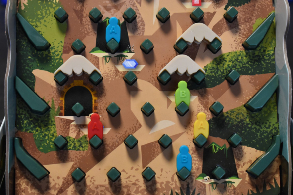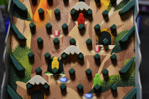 Abschließend zieht Ihr Eure Hand wieder auf drei auf und falls Eure Figur ganz oben am Gipfel bei einem Saphir steht, nehmt Ihr sie auf Euer Tableau wieder zurück. Dann ist die nächste Person an der Reihe.