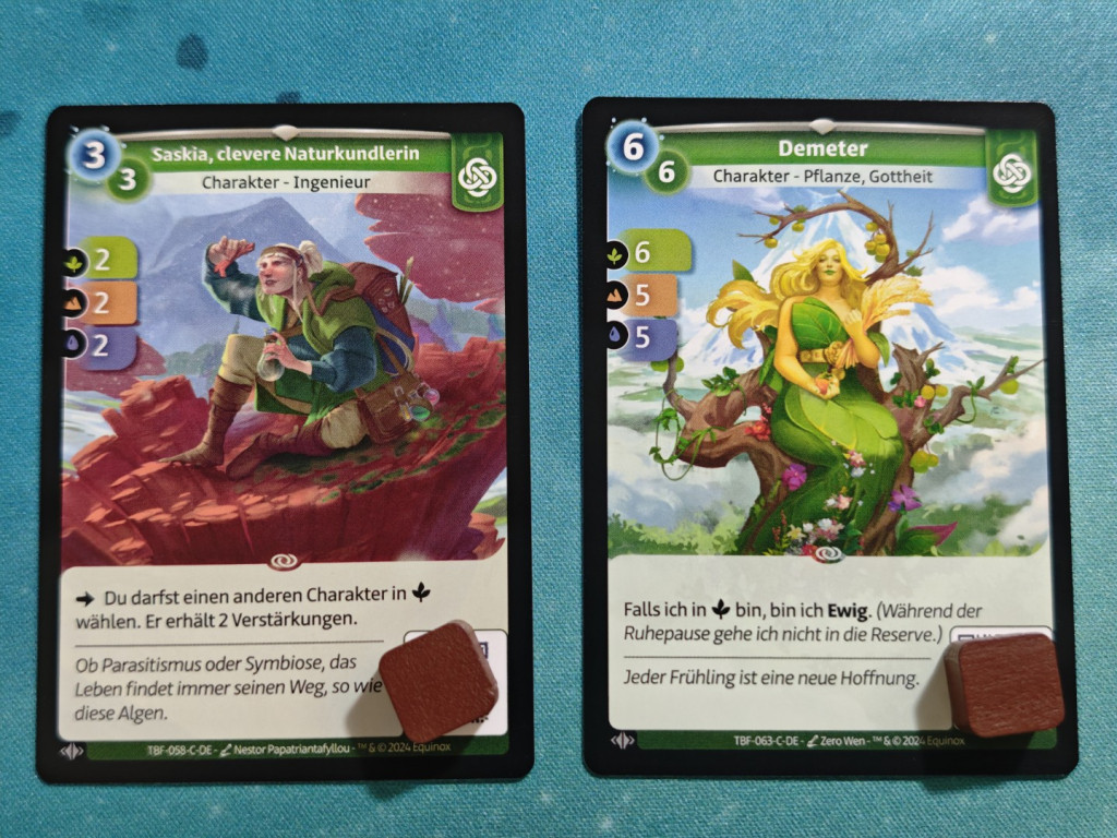 Natürlich führt das zweite Set auch jede Menge Karten ein, welche andere Karten gezielt in den erschöpften Zustand versetzen. Sogar Wahrzeichen können jetzt erschöpft werden. Und damit das Erschöpfen auch wirklich spannend wird, gibt es nun Effekte, die gezielt mit erschöpften Karten interagieren. Einige Effekte belohnen, wenn bestimmte Karten erschöpft sind, z. B.: „Wenn eine erschöpfte Karte in deiner Reserve liegt, erhält diese Expedition +1 Energie“. Andere Effekte bestrafen, wenn Karten erschöpft sind, z. B.: „Wenn ein erschöpfter Charakter in dieser Expedition liegt, verliert diese Expedition einen Aktionspunkt“.