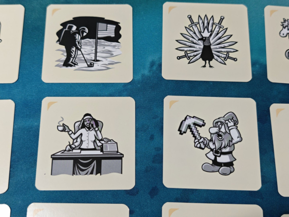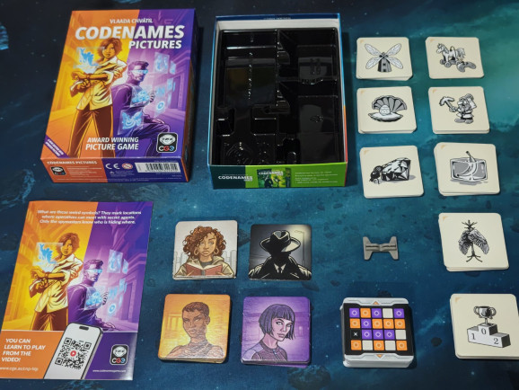 Die Spielvorbereitung verläuft ganz Codenames-typisch: man teilt sich auf in zwei Teams; jedes Team benennt einen Tippgeber, der Rest des Teams muss raten. Dann werden 20 Karten mit Bildern ausgelegt, in einem 5x4 Raster. Das sind also 5 Karten weniger als in den Codenames Wort-Varianten, bei denen ein 5x5 Raster ausgelegt wird.