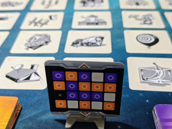 Die Schlüsselkarte zeigt an den Rändern eine orangene oder violette Markierung – das entsprechende Team beginnt und muss deshalb ein Bild mehr erraten. Es erhält also das Plättchen des Doppelagenten und dreht es auf die Seite, welche einen Agenten in Teamfarbe zeigt. Nun kann es losgehen.