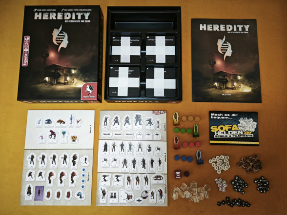 Heredity besteht hauptsächlich aus viereckigen, durchnummerierten Karten, die den gesamten Spielverlauf steuern. So gibt es zum Beispiel Geländekarten, auf denen man seine Charaktere bewegt, Gegenstandskarten, die ausgerüstet werden können und besondere Fähigkeiten verleihen und Zeitleistenkarten, welche den zeitlichen Ablauf von Ereignissen steuern. Hinzu kommen Papp-Aufsteller mit Plastik-Füßchen, einige Pappmarker und Aktionsscheiben aus Holz in den vier Spielerfarben. Das Spielmaterial lässt sich in keiner Weise als besonders hochwertig oder umfangreich bezeichnen. Das ist nicht die Kategorie, in der Heredity glänzt. Aber das Material ist vollkommen ausreichend, um in die Geschichte einzutauchen und für ein immersives Spielerlebnis zu sorgen. Man hätte Heredity mit Miniaturen aufblähen können und so sicher UVP sowie Platzbedarf im Regal mehr als verdoppelt. Wir sind froh, dass hier „nur“ die Papp-Aufsteller zum Einsatz kommen.
