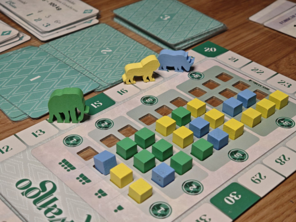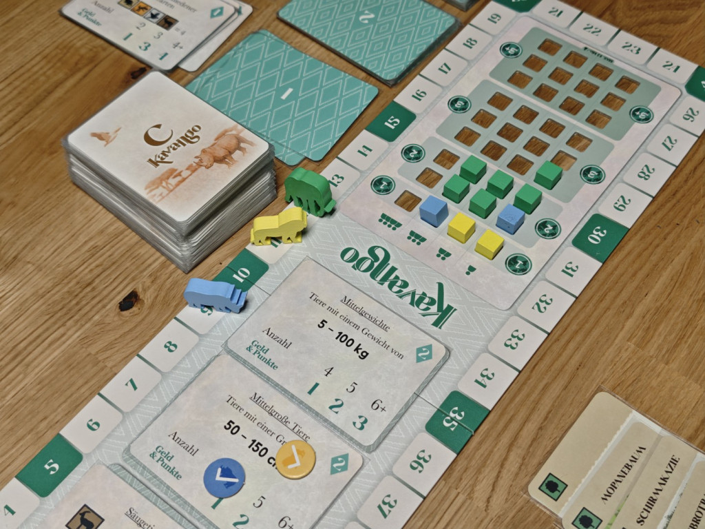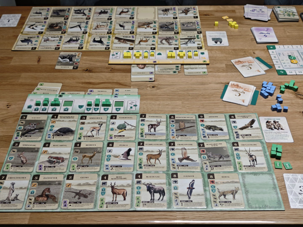 Jeder Spieler nimmt sich nun das Material in seiner Spielerfarbe: grün, orange, blau oder gelb. Dazu gehören die Geldmarker, kleine Holzwürfel. Diese kommen allerdings beiseite, in einen Vorrat, von dem aus man sich bedient, immer dann, wenn man Geld erhält. Man kann mit einem Startkapital von 0-2 Geldmarkern spielen, je nach Lust und Laune. Außerdem nimmt sich jeder Spieler seine Tierfigur, die auf die Siegpunkteleiste des Spielplans platziert wird, zwei Zählchips, die benötigt werden, wenn die Tierfigur die 50 Punkte-Marke knackt, und vier Checkmarker, mit denen man im Spielverlauf erfüllte Forschungsaufträge markiert.
