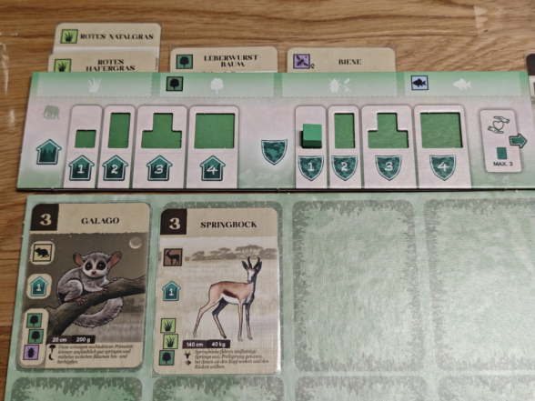 Spielt man eine Wildniskarte aus Deck B oder Deck C, also ein Tier, so muss man zunächst prüfen, ob alle Voraussetzungen erfüllt sind, um das Tier ins eigene Reservat aufzunehmen. Hat man alle Tierarten oder Produzenten in der benötigten Kombination und Anzahl bereits ausliegen, und erfüllt man ggf. die Schutzvoraussetzungen, so darf auch die gespielte Tierkarte ins Reservat aufgenommen werden. Hat man die benötigten Produzenten oder Tiere nicht ausliegen oder erfüllt die Schutzvoraussetzungen nicht, muss die Karte in die Auffangstation. Aber Achtung: hier dürfen nur maximal drei Karten liegen. Sobald zu einem späteren Zeitpunkt alle Voraussetzungen einer Wildniskarte in der Auffangstation erfüllt werden, wandert sie direkt und automatisch ins Reservat, ohne dass hier eine extra Aktion notwendig wäre. Die Auffangstation ist also eine praktische Pufferzone.