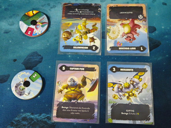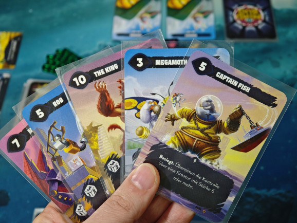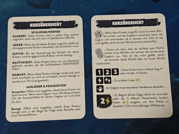 Die zweite Option „mit einer Kreatur angreifen“ ist fast genauso simpel. Man wählt eine Kreatur im eigenen Spielbereich als Angreifer. Der Gegner darf dann entscheiden, ob er mit einer seiner Kreaturen den Angriff blocken möchte oder nicht. Tut er dies nicht, verliert er einen Lebenspunkt. Wenn er mit einer seiner Kreaturen blockt, werden die Stärkewerte der Kreaturen verglichen. Die Kreatur mit weniger Stärke wird auf den jeweiligen persönlichen Ablagestapel gelegt. Bei Gleichstand werden beide Kreaturen besiegt. Angreifen wäre aber nur halb so interessant hätten Kreaturen keine Schlüsselwörter. Denn diese sorgen dafür, dass sich die Grundregeln des Kampfes ändern. Mit Raserei darf man zweimal hintereinander angreifen. Mit Jäger darf man selbst die Kreatur des Gegners wählen, die blocken soll. Giftige Kreaturen besiegen auch stärkere und raffinierte Kreaturen können nur von anderen raffinierten Kreaturen geblockt werden. Neben den Schlüsselwörtern haben Kreaturen oft noch Fähigkeiten, die entweder permanent sind oder zu bestimmten Zeitpunkten ausgelöst werden können, z.B. beim Ausspielen oder wenn eine Kreatur besiegt wurde.