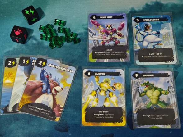 Schauen wir uns den Spielaufbau an. Wie immer erhält jeder Spieler seine zwei Mindbugs, die er offen vor sich auslegt. Will heißen: nur zweimal während einer Partie darf man mindbuggen, also eine Kreatur, die der Gegner gerade spielen möchte, klauen und stattdessen selbst ausspielen. Diese zwei Mindbugs gilt es weise einzusetzen; „Mindbuggen“ ist die Kernmechanik in Mindbug und ein wichtiges strategisches Element. Neben den Mindbugs erhält jeder Spieler im King of Tokyo Crossover auch einen Würfel. Er zeigt ähnlich wie die Würfel in King of Tokyo die Zahlen 1, 2, und 3 sowie Blitz- und Tatzen-Symbole. Nur die Herzen fehlen.