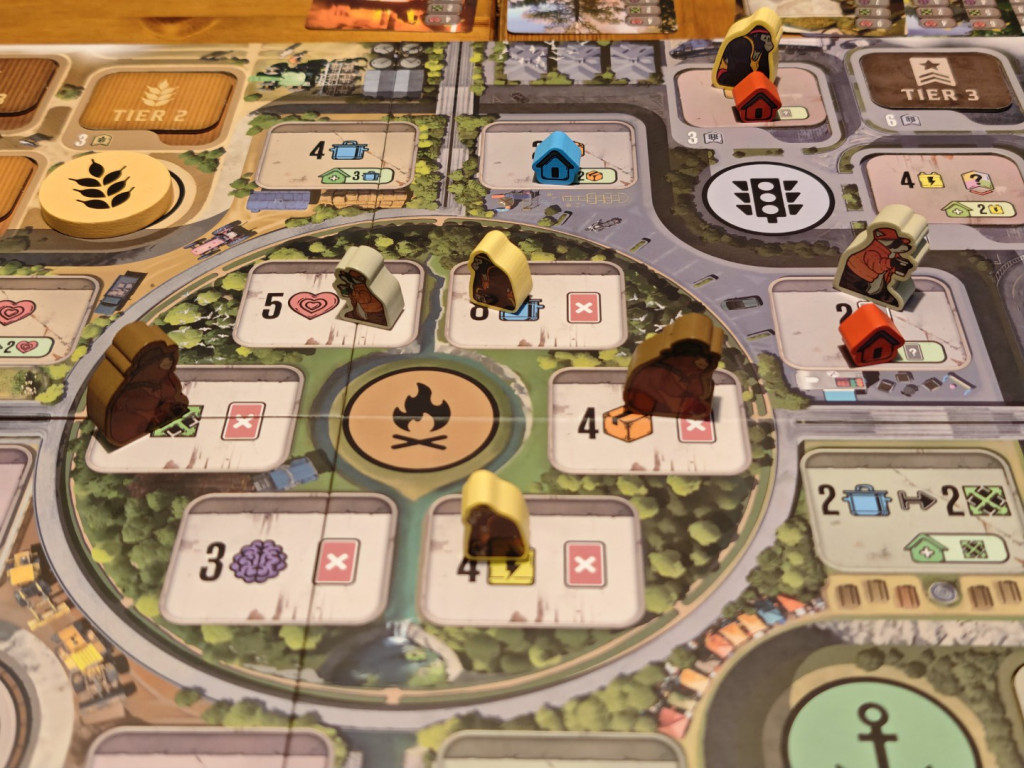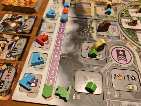 Die zweite Aktion „eine Erkundungskarte spielen“ erlaubt das Ausspielen einer Basis-Erkundungskarte oder einer fortgeschrittenen Erkundungskarte von der Hand. Das kostet Ressourcen. Aber nicht erschrecken: oben links sind die Kosten angezeigt, aber man muss nur einen der drei Ressourcen-Typen in der angegebenen Anzahl bezahlen, je nachdem an welche der Ressource man besser rankommt oder gerade zur Verfügung hat: Ausdauer, Beweglichkeit oder Intelligenz. Manche Karten haben auch eine Voraussetzung, dargestellt unterhalb der Kosten fürs Ausspielen und rot hinterlegt. Beispiele für Voraussetzungen sind eine bestimmte Position auf einer der Autoritätsleisten, einen Arbeiter in einem bestimmten Distrikt oder bereits gespielte Karten mit bestimmten tags. Karten sind Siegpunkte-Quelle und geben verschiedene Boni, Einkommen, Fähigkeiten oder Aktionen. Je nach Funktion der Karte wird sie unterschiedlich platziert, sodass man immer eine gute Übersicht behält. Denn am Ende einer Partie wird man einige vor sich ausliegen haben. Im Übrigen: Basis-Erkundungskarten sorgen eher für Ressourcen-Generierung, während fortgeschrittene Erkundungskarten mehr Siegpunkte geben und im späteren Spielverlauf wichtiger werden.