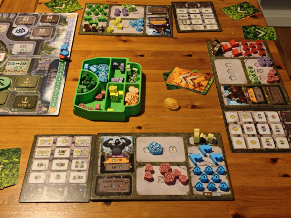 Natera: New Beginning wurde durch eine Crowdfunding Kampagne auf Kickstarter ins Leben gerufen. Anders als bei anderen Kickstarter Kampagnen, war Natera: New Beginning von vorneherein „fully stretched“, d.h. direkt und ausschließlich in einer Deluxe Variante erhältlich. Und diese kann sich, was Materialqualität und -Umfang betrifft, auch wirklich sehen lassen. Wir haben viele verschiedene Tierfiguren aus Holz, screen-printed. Wir haben neben doppellagigen Spieler-Tableaus sogar einen doppellagigen Spielplan in der Tischmitte. Wir haben alle Ressourcen aus Holz in verschiedenen Farben und Formen, ebenfalls bedruckt. Und sie finden Platz in zwei herausnehmbaren Plastik-Trays, sodass sie auf dem Tisch verteilt werden können und jeder Spieler alle Ressourcen in Reichweite hat. Dafür zahlt man dann aber auch knapp 100 EUR. Genug der Vorrede.