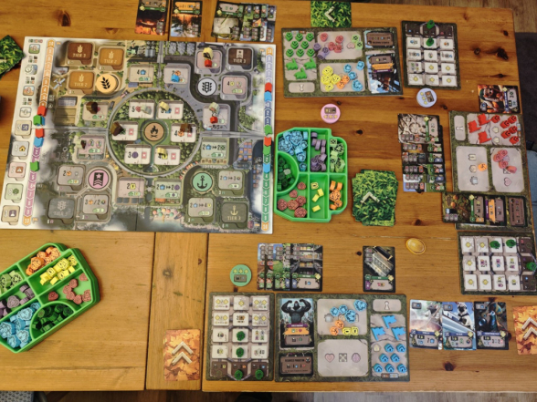Auf dem Spielplan müssen noch ein paar mehr Vorbereitungen getroffen werden: Die vier Distrikt-Scheiben werden auf die jeweiligen Felder platziert. Sie werden von Spielern beansprucht, wenn sie auf der jeweiligen Autoritätsleiste des Distrikts in Führung gehen. Der Besitzer einer Scheibe erhält zusätzliches Einkommen in den Ruhephasen. Außerdem werden für jede der fünf Kategorien ein zufälliges Anrechtsplättchen ausgewählt und platziert. Diese geben Ziele vor, für die der erste Spieler bei Erreichen ordentlich Siegpunkte erhält. Zuletzt kommt der Rundenmarker – die weiße Uhr - auf Feld 1 der Rundenleiste.