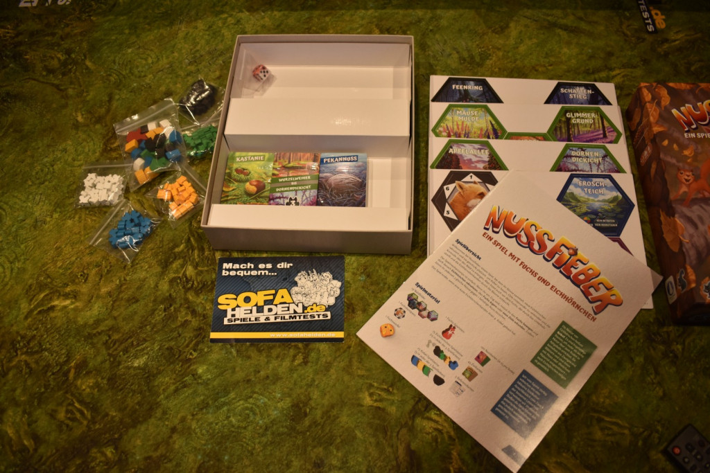 Passend zur naturnahen Thematik hätte man NussFieber vielleicht etwas nachhaltiger verpacken können. Das Spielmaterial an sich ist hauptsächlich aus Holz und Karton, lediglich der Würfel aus Kunststoff. Allerdings sind sowohl die Holzfiguren, als auch die Karten in Kunststoff verpackt. Immerhin sind die Figuren in Zipp-Beuteln untergebracht, die wiederverwendet werden können. Mit dabei sind vier Stanzbögen, aus denen Ihr die Waldfelder und den Fuchskompass befreien müsst. Die Karten sind in Folie eingeschweißt. Insgesamt ist die Gestaltung sehr gut gelungen und thematisch passend. Interessant sind aber auch die Eichhörnchen-Figuren, die pro Farbe unterschiedlich aussehen. So könnte man fast meinen, dass Spiel wäre für Farbenblinde geeignet, wären da nicht die Kobel, diese sind nämlich wiederum, abgesehen von der Farbe, identisch. Die Eichhörnchen sind niedlich und der Fuchs passt auch sehr gut ins Konzept. Er ist auch die einzige Figur, die noch mit Details bemalt ist.