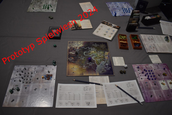 Nach einem Jahr ist das Gedächtnis nicht mehr so gut, aber dafür hat man ja alles bereits in Bildform festgehalten. Links seht Ihr den Prototypen von der Spielwiesn 2024 zum Vergleich der Entwicklung zum jetzigen Prototyp. Als Restless bei uns ankam, merkte man schon: das Spiel hat es in sich. Vom Gewicht her wirkte es fast schon so, als hätte jemand Steine in die Schachtel gepackt, aber es war wirklich nur das reine Spielmaterial. Kein Inlay, nur mit Luftpolsterfolie geschützt (keine Sorge, im finalen Spiel wird das nicht mehr so sein). Nach etwas Auspackarbeit lag das Spielmaterial vor uns. Die Charakterboards wirken schon sehr ausgereift. Die Double-Layer-Boards machen schon einen (fast) fertigen Eindruck und bieten Platz für Eure Ausrüstungen und diverse Marker. Der Spielplan und der Block mit den Charakterbögen haben sich noch am wenigsten verändert, auch wenn selbst hier viele Details anders sind. Das Material für die Charaktere ist in Stoffbeuteln untergebracht, die schon in dieser Version einen ganz guten Eindruck machen. Die Karten sind quasi noch lose, vom Design her aber auch schon sehr gut gelungen. Auch die Größen und Formen gefallen uns sehr gut. Die Klassenkarten sind quadratisch, die Story und Ausrüstungskarten sind im kleinen Format und die Fähigkeiten in einem etwas größeren Format gehalten. Noch größer sind nur die Karten - beziehungsweise eigentlich schon Tableaus - der Bosse, von denen es einige gibt. Die Würfel sind in verschiedenen Farben vorhanden und machen auch einen sehr soliden Eindruck. Lediglich die Farben Lila und Rot sind schwer auseinanderzuhalten. Aber hier wird noch nachgebessert. Das wichtigste Element des Spiels ist das Abenteuerbuch. Dieses ist nicht nur sehr schwer, sondern wirkt ebenfalls schon sehr hochwertig. Das Einzige, was wir hier befürchten, ist dass die Seiten bei dem Gewicht irgendwann ausreißen könnten. Etwas übersichtlicher ist das Buch für den Handel und die Schätze. Dieses werdet Ihr im Spielverlauf auch noch öfter benötigen. Die Ressourcen lagen in unserer Version als Kartonmarker bei (so wie auch in der Standardedition auf Gamefound). Aus Holz wiederum waren die vier Charaktere, die sehr süß aussehen.
