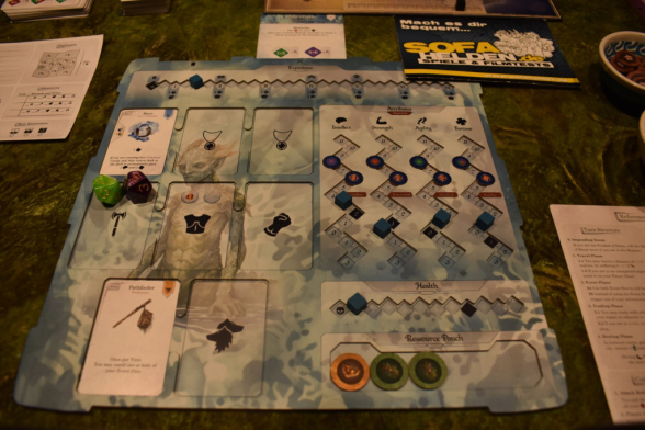 Nachdem Ihr Euren Zielort erreicht und gegebenenfalls erkundet habt, folgt der größte Teil des Spiels: Die Eventphase. Hierbei werft Ihr die beiden Eventwürfel und erhaltet so eine Zahl. Eine andere Person nimmt das Abenteuerbuch und sucht die Kombination aus Gebiet und dieser Zahl heraus. Manche Events bringen Euch „nur“ etwas Geschichte, andere bringen Euch Vorteile in Eurer Reise in Form von Ressourcen, Ruf oder Erfahrung und wiederum andere führen in einen Kampf. Manchmal müsst Ihr würfeln, um zu sehen was passiert. Das könnt Ihr aber durch Eure Attribute beeinflussen und manchmal dürft Ihr Euch auch entscheiden, was ihr macht. Kommt es zu einem Kampf, werden das Abenteuerbuch offen ausgelegt und die Würfel auf den Lebenspunkten der Gegner platziert. Dann würfelt Ihr gleichzeitig und macht Euch so durch die Kombination aus Würfelergebnis und Fertigkeiten, gegenseitig Schaden. Dieses Prinzip ist sehr interessant, weil Ihr eben nicht möglichst hoch würfeln müsst, sondern die Ergebnisse, die Eure Fertigkeitskarten vorgeben. Außerdem hat jeder Charakter die Möglichkeit die eigenen Würfelergebnisse und die des Monsters zu beeinflussen. Entweder durch neuwürfeln oder addieren/subtrahieren bestimmter Werte.