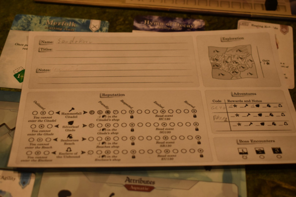 Wir sind im Bereich Pen & Paper absolut unerfahren und würden daher Restless als eine Art Einstiegsspiel in dieser Richtung bezeichnen. Ein Abenteuer besteht aus drei Episoden, die jeweils in einen Bosskampf münden. Dabei versucht Ihr möglichst viel Erfahrung zu sammeln, Eure Fertigkeiten und Ausrüstung zu verbessern und die Karte zu erkunden. Wie lange die Episoden dauern hängt sehr stark von den Mitspielenden ab, aber auch etwas vom Würfelglück, denn wann der Boss erscheint, entscheidet die Untergangsleiste. Wie schnell Ihr darauf vorlauft, entscheidet wiederum der Untergangswürfel. Bei uns dauerten die Episoden zwischen drei und dreieinhalb Stunden. Es ist aber auch möglich/vorgesehen, das Spiel jederzeit zu unterbrechen und zu „speichern“. Hierfür ist die Rückseite der Charakterbögen entsprechend auszufüllen.