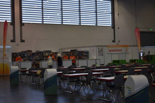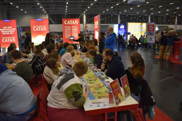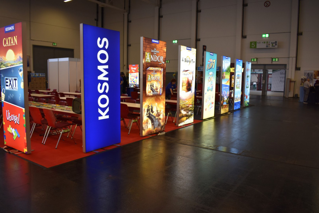 Dieses Jahr waren wir bewusst noch etwas früher als sonst auf der Messe. Nicht nur, weil wir es durch die Ferien mit den Kindern konnten, sondern auch, weil wir Großes vorhatten. Eine kleine Idee war etwas eskaliert und endete in mehr Planung als erwartet. Damit war unser erster Weg nach der Anmeldung erst einmal der Kosmos-Stand zur Abstimmung bezüglich unseres Catan Connect Events. Dieses Jahr in Halle 5, denn die Ausstellerhalle wurde mit der Halle der Spielfläche getauscht. Noch wirkte alles sehr ruhig. Die Aussteller*innen bereiteten Ihre Stände vor, die Erklärer*innen die Spielothek und auch an anderer Stelle bereitete man sich auf die Besuchenden vor.