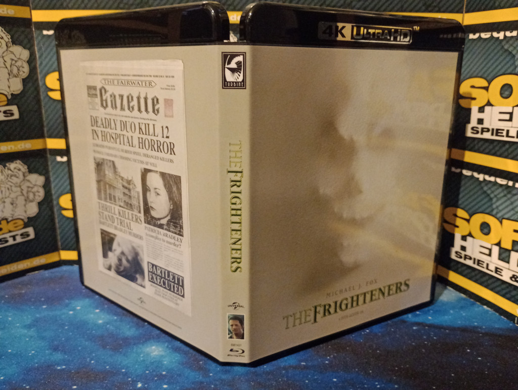 Die Full Slip Edition bietet auf dem Slip-Cover das gleiche Motiv wie die Mediabook-Variante C und zeigt im Vordergrund Michael J. Fox und Trini Alvarado gemeinsam mit dem Sensenmann, während im Hintergrund einige Geister sowie das "Licht am Ende des Tunnels" zu sehen sind. Die Rückseite zeigt dagegen Frank Bannister mit seinen drei Geister-Kollegen, während das Infoblatt mit den üblichen Inhaltsangaben und Details lediglich lose aufgelegt wurde. Die Softbox im Inneren bietet schließlich das altbekannte Covermotiv von The Frighteners, welches auch auf der Mediabook-Variante A zu sehen ist. Auf dem Backcover ist ein Zeitungsausschnitt aus der Fairwater Gazette zu sehen, der sich mit dem Fall Johnny Bartletts beschäftigt. Die drei Discs der Full Slip Edition umfassen die Kinofassung sowie den Director´s Cut, jeweils auf einer 4K UHD, sowie eine Bonus Blu-ray mit über sechs Stunden Extras, wobei vor allem das 95-minütige Interview mit Cast & Crew sowie das unglaubliche 270-minütige Making-Of hervorzuheben sind.