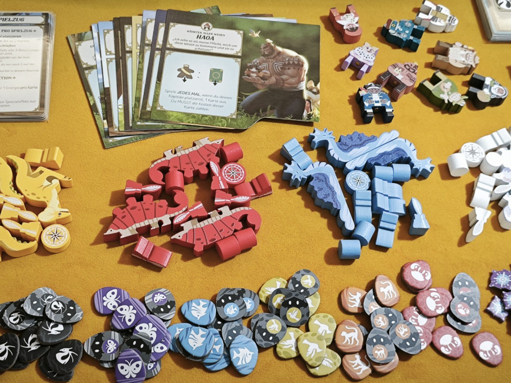 Letztlich platziert jeder Spieler seinen Punktemarker auf die Siegpunkteleiste des Spielplans und nimmt sich seine drei Besatzungsmitglieder. Eine der drei Besatzungsmitglieder hat einen kleinen Magneten auf dem Rücken. Auf diese Figur wird der Kapitän platziert, der ebenfalls magnetisch ist. Kapitäne haben unterschiedliche Fähigkeiten. Jeder Spieler erhält zwei Kapitänskarten, von denen er sich eine aussucht. Die Kapitänskarte wird auf das Spielertableau platziert. Darauf kommt dann noch das Gesperrt-Plättchen, um anzuzeigen, dass die Kapitänsfähigkeit noch nicht freigeschaltet ist. Gleichzeitig zu den Kapitänskarten erhält jeder Spieler acht Wesenskarten, von denen vier behalten und die restlichen vier abgeworfen werden müssen. So bildet man seine Starthand. Ist alles vorbereitet, kann es endlich losgehen.