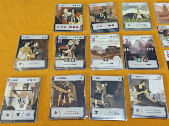 Zuletzt ist noch die Aktion „Errungenschaft entwickeln“ von zentraler Bedeutung, gerade für die Siegpunktgenerierung im Endgame. Das funktioniert ähnlich wie „Siedlungen bauen“. Statt einer Karte von der Hand wählt man eine verfügbare Errungenschaftskarte aus der Auslage. Dabei gibt es zwei Bedingungen: Erstens darf man nur dann eine Karte eines höheren Levels wählen, wenn man bereits mindestens ebenso viele Karten des niedrigeren Levels fertiggestellt hat. Man darf also niemals mehr Level-2-Errungenschaften als Level-1-Errungenschaften haben (analog für Level 3 zu Level 2). Die zweite Voraussetzung ist, mindestens eine der benötigten Ressourcen zu besitzen, um die Entwicklung zu beginnen. Diese wird auf der Karte platziert. Ressourcen können über mehrere Runden gesammelt werden. Es darf jedoch immer nur eine Errungenschaft zur selben Zeit entwickelt werden, niemals mehrere gleichzeitig.