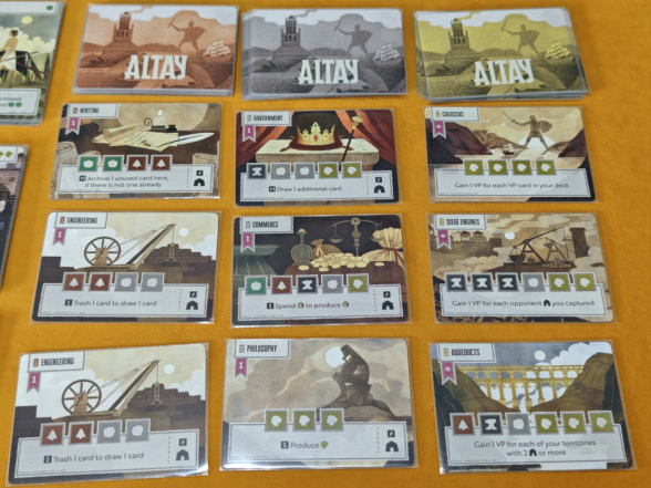 Spielspaß/Spielgefühl: Altay ist ein Mix aus Deckbuilding, Ressourcenmanagement und Area Control. Obwohl der zentrale Spielplan, auf dem man sich durch das Platzieren seiner Siedlungen ausbreitet, im Mittelpunkt des Geschehens steht, fühlt sich Altay nicht wie klassische Area-Control-Spiele an. Man breitet sich in der ersten Spielhälfte zwar auf dem Spielplan aus, und hier kommt es insbesondere darauf an, wie schnell man das tut. Sobald die Spieler allerdings aufeinandertreffen, verhärten sich schnell die Fronten. Man kann viel schneller Siedlungen errichten, als man sie im Kampf vernichten kann. Land gegenüber gegnerischen Mitspielern „gutzumachen“, ist so gut wie unmöglich. Haben sich einmal Fronten ausgebildet, bleiben sie weitestgehend bestehen.