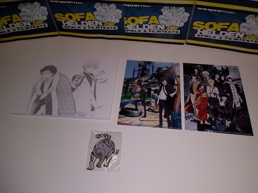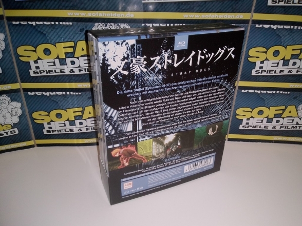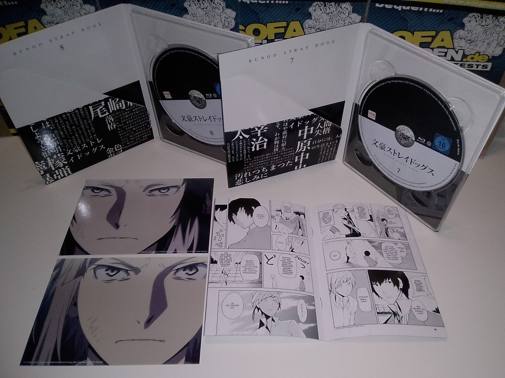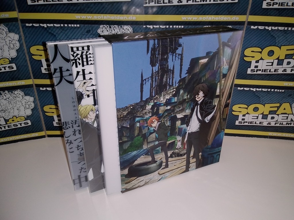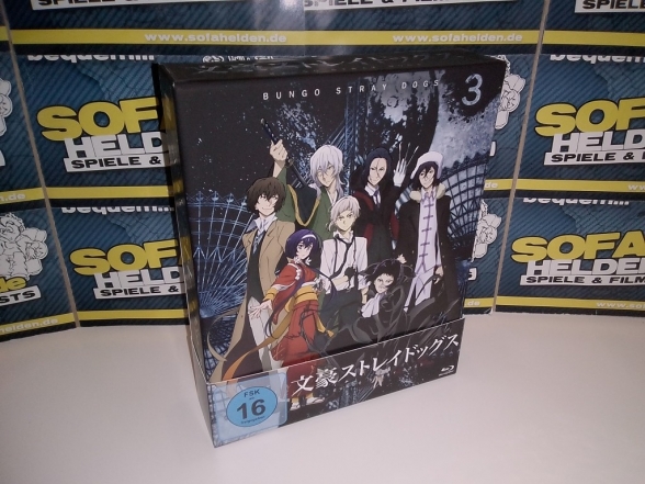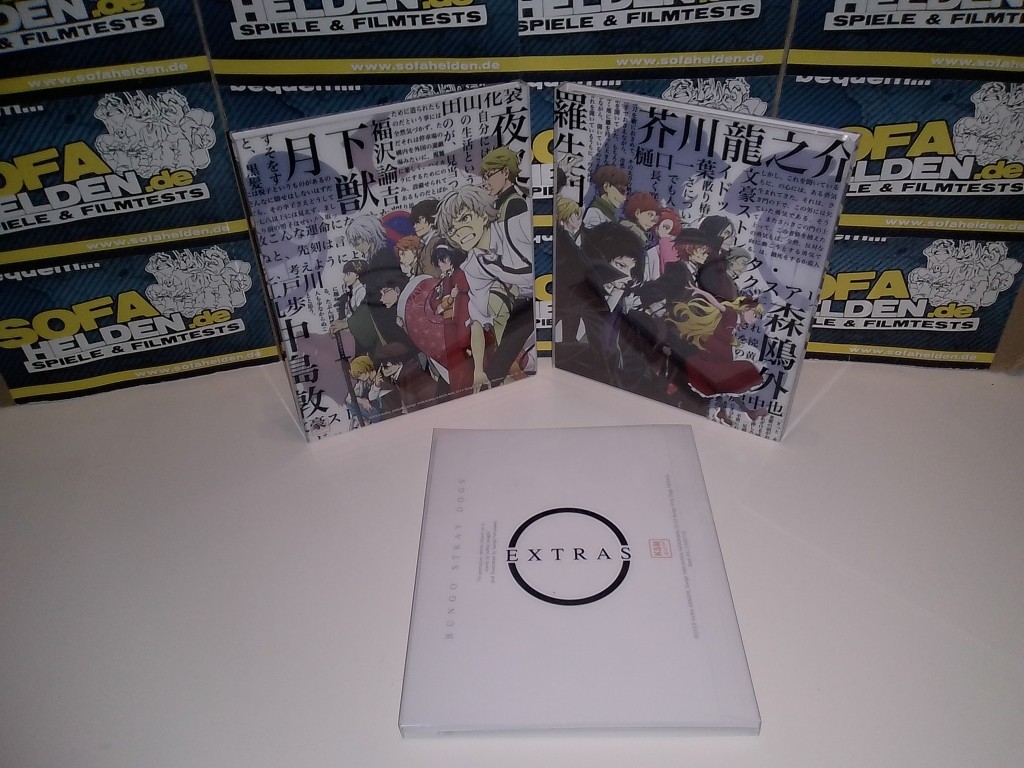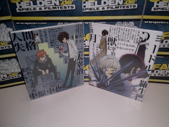 Mit der Box zur dritten Staffel von Bungo Stray Dogs präsentiert Koch Films / KSM Anime erneut ein wahres Freudenfest für alle Fans. Die Aufmachung der Box setzt dabei konsequent den bisherigen Stil weiter fort, was bedeutet dass auch Staffel 3 als Digipaks in einem massiven Sammelschuber untergebracht wurde. Der Schuber zeigt dabei auf der Front ein Gemeinschaftsbild der wichtigsten Staffelcharaktere, während die Rückseite ein Bild der beiden Fanlieblinge Chuya und Dazai zeigt. Umschlossen wird der gesamte Schuber von einer Art J-Card aus stabilem Karton, auf welchem sich auch die üblichen Inhaltsangaben und Details befinden. Die beiden Digipaks mit den Discs zeigen zahlreiche Charaktere der Serie und sind erneut von einem durchsichtigen O-Card Schuber im bekannten Stil umschlossen. Anstatt eines dritten Digipaks liefert die Box der dritten Staffel zudem ein umfangreiches Extras-Paket, zu dem neben einem "Menschentiger"-Schlüsselanhänger und vier Artcards auch eine Leseprobe des Mangas zur Serie, ein 44-seitiges Sketch Artbook sowie ein 28-seitiges Booklet gehören. Letzteres bietet eine Vielzahl an Charakterinformationen sowie ein kleines "Booklet-Manga" und diverse Locationbilder.