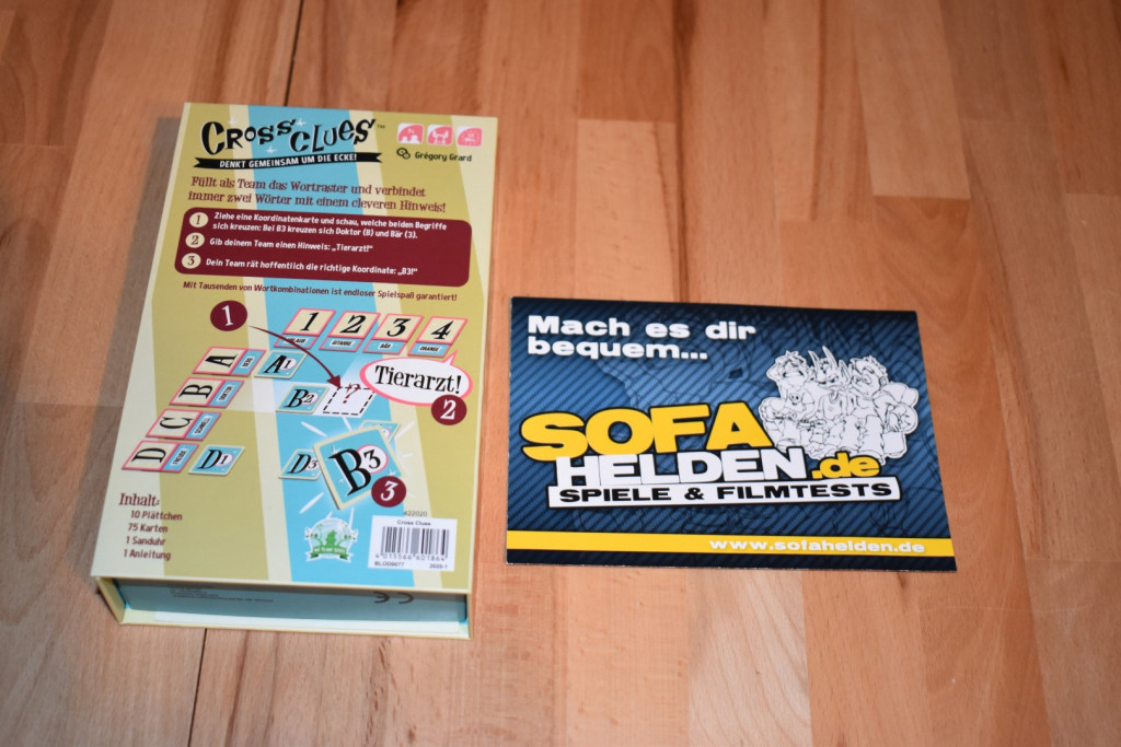 Cross Clues ist ein kooperatives Spiel. Runde um Runde erhaltet ihr eine Koordinatenkarte, die für zwei Begriffe steht. Ihr müsst den Anderen nun ein Wort nennen, das die beiden Wörter so beschreibt, dass sie eure Koordinate erraten. Liegen sie richtig, legt ihr die Koordinatenkarte in das Raster. Liegen sie falsch, legt ihr die Karte beiseite und zieht eine neue. Sobald der Stapel der Koordinatenkarten aufgebraucht ist, endet das Spiel. Alternativ, wenn die Sanduhr abgelaufen ist. Dann könnt ihr in der Tabelle in der Anleitung ablesen, wie gut Ihr wart.