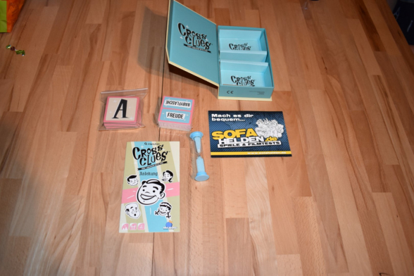 Cross Clues ist in einer sehr kompakten und ansprechenden Verpackung untergebracht. Ähnlich eines Buches, lässt sich die Verpackung aufklappen und schließt über einen Magneten. Im Inneren findet sich ein eingeschweißter Stapel mit den Wortkarten, fünfzig an der Zahl, und ein Stapel Karten in einem wiederverschließbaren Plastikbeutel. In diesem sind sowohl die Rasterplättchen als auch die Koordinatenkarten untergebracht. Das Inlay ist aus gefaltetem Karton und bietet neben den erwähnten Stapeln auch noch Platz für die Sanduhr.