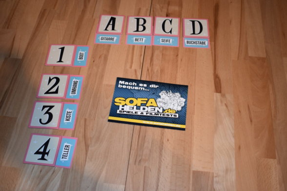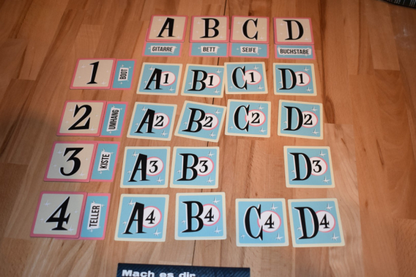 Nachdem die Wortkarten ausgepackt sind, kann es auch schon an den Aufbau gehen. Hierfür wählt ihr zuerst, ob ihr in einem 3x3, 4x4 oder 5x5 Raster spielen möchtet. Dementsprechend nehmt ihr die hierzu passenden Rasterplättchen und Koordinatenkarten. Die übrigen legt ihr zurück in die Schachtel. Die Rasterkarten werden so ausgelegt, dass sie die Ränder eines Quadrats bilden und man aus der Kombination der Buchstaben und Zahlen Koordinaten aus Zeilen und Spalten bilden kann. Nun werden die Wortkarten gemischt und sechs bis zehn (je nach gewähltem Raster) unter die Rasterkarten gelegt, sodass man unter bzw. neben jeder Rasterkarte einen Begriff sieht. Dann werden die Koordinatenkarten gemischt und als Nachziehstapel bereitgelegt. Ihr dürft dann noch gemeinsam entscheiden, ob ihr die Sanduhr mitbenutzen wollt oder lieber ohne Zeitdruck spielt. Dann kann es auch schon losgehen.
