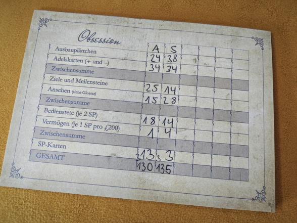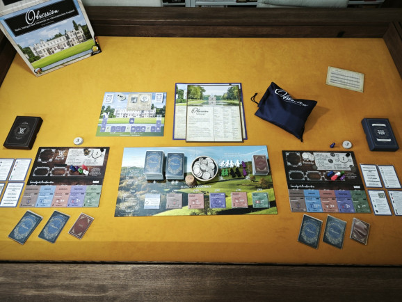 In Obsession geht es darum den in die Jahre gekommenen Familienbesitz aufzupäppeln und das Ansehen der Familie wiederherzustellen. Erfolg wird in Siegpunkten gemessen. Die Regel enthält hier eine geniale Übersicht: ein Tortendiagramm, das genau zeigt, wieviel Prozent der Siegpunkte man von welcher Quelle erwarten darf. Siegpunkte stehen auf Adelskarten, auf Ausbauten, auf Siegpunkte-Karten und auf Zielkarten. Adelige, die man im Spielverlauf ins persönliche Deck aufgenommen hat, und Ausbau-Plättchen, die man auf sein Landgut platzierte, machen etwa 50% der Siegpunkte aus. Am Spielende kann der Endstand des Ansehensmarkers nochmal richtig viele Siegpunkte geben. Außerdem gibt es 2 Siegpunkte für jeden Bediensteten und Siegpunkte für übriges Geld.