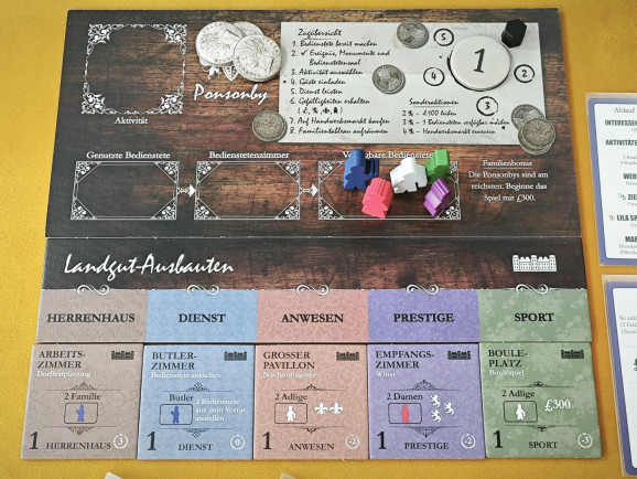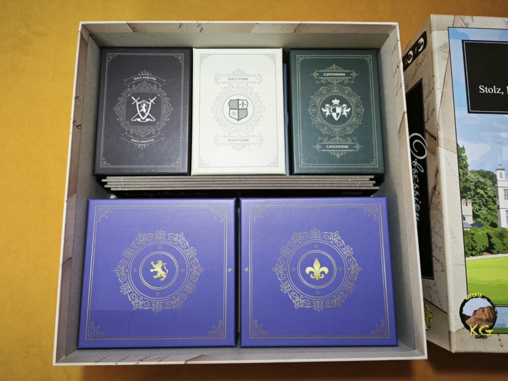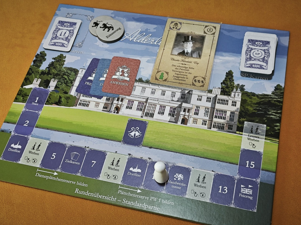 Das Artwork des gesamten Spielmaterials passt hervorragend zum Thema viktorianisches England. Das auf dem Tableau der Rundenübersicht abgebildete Schloss oder die Graslandschaft auf dem Derbyshire-Tableau versetzen Dich während der Partie in diese Zeit zurück. Die Adels-Karten zeigen schwarz-weiß Fotografien der Familienmitglieder und Gäste. Die Holz-Figuren in den verschiedenen Farben und Formen, welche die Bedienstete auf eurem Hof repräsentieren, machen ebenso Freude. Aber was dem Spielmaterial fast die Show stiehlt sind die Schachteln aus dicker Pappe mit buntem Artwork, die zur Aufbewahrung des Spielmaterials dienen. Jeder Spieler hat eine eigene Schachtel, das sämtliches Spielermaterial beinhaltet. Tausendmal besser als ein Plastik-Inlay. Mit den ganzen Erweiterungen (Upstairs Downstairs; Wessex; Promo Plättchen) wird es allerdings eng. Wir haben uns ein YouTube-Video angeschaut, um herauszufinden wie alles gut sortiert in die Schachtel passt. Die gute Nachricht: alles passt in die Schachtel des Grundspiels, auch sinnvoll sortiert.