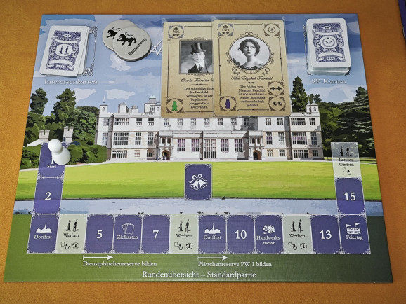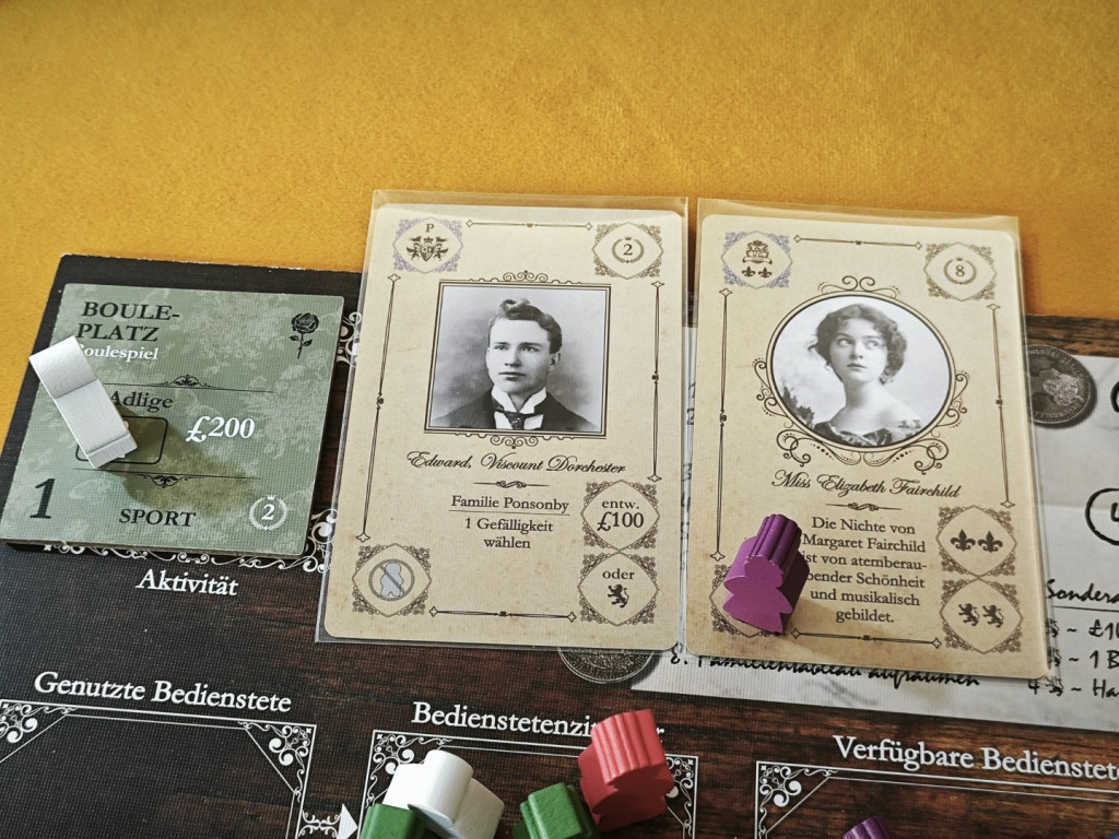 Neben der Rundenübersicht werden die Karten „Charles und Elizabetz Fairchild“ platziert, die an ihrem violetten Rahmen zu erkennen sind. Um diese beiden Adeligen buhlen die Spieler, denn sie bieten die besten Gefälligkeiten und können ohne Ansehens-Voraussetzung gespielt werden.