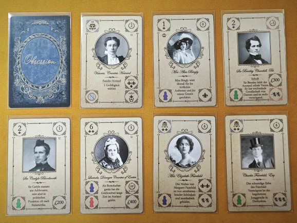 Alle Adelskarten sind ähnlich aufgebaut: oben links befindet sich der Prestigewert und oben rechts die Siegpunkte, die es am Spielende gibt. Unten links ist der benötigte Bedienstete abgebildet, um die Adelskarte spielen zu können und unten rechts befinden sich die Belohnungen, in Obsession als Gefälligkeiten bezeichnet, welche die Adelskarte bietet, wenn sie während einer Aktivität verwendet wird.