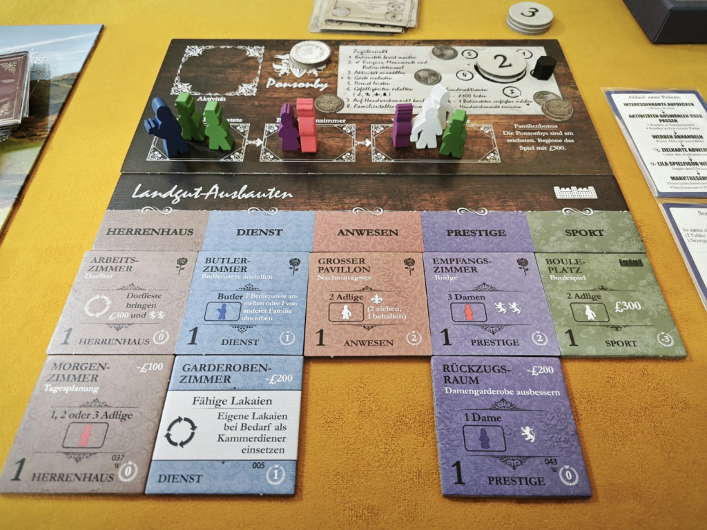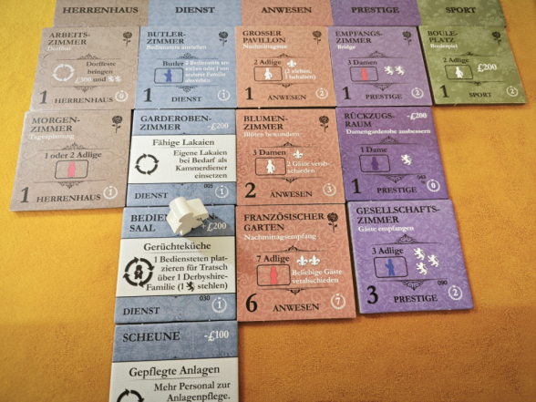 In Schritt 2 „Ereignis, Monumente und Bedienstetensaal prüfen“ werden je nach Spielsituation verschiedene Aktionen ausgeführt. Oft passiert aber auch einfach gar nichts. Zuerst wird geschaut, ob das aktuelle lilane Feld auf der Rundenübersicht ein Ereignissymbol zeigt. Ist dies der Fall, tritt das Ereignis in Kraft. Bei einem Dorffest z.B. erhalten alle Spieler, die zuvor bereits das Arbeitszimmer verwendet hatten, 300 GBP und 2 Ansehen. Und durch das Ereignis „Zielkarten ziehen“ darf jeder Spieler 2 neue Zielkarten ziehen. Die Ereignisse Handwerksmesse und Feiertag haben Auswirkungen auf spätere Schritte des Spielerzugs. Als nächstes erhält man Ansehen entsprechend der Anzahl an Monumenten auf dem eigenen Landgut-Planer. Und zuletzt, sollte man einen Bedienstetensaal haben, darf man dort einen Bediensteten platzieren, um Gerüchte zu streuen und somit ein Ansehenspunkt von der Familie eines Mitspielers zu stehlen.