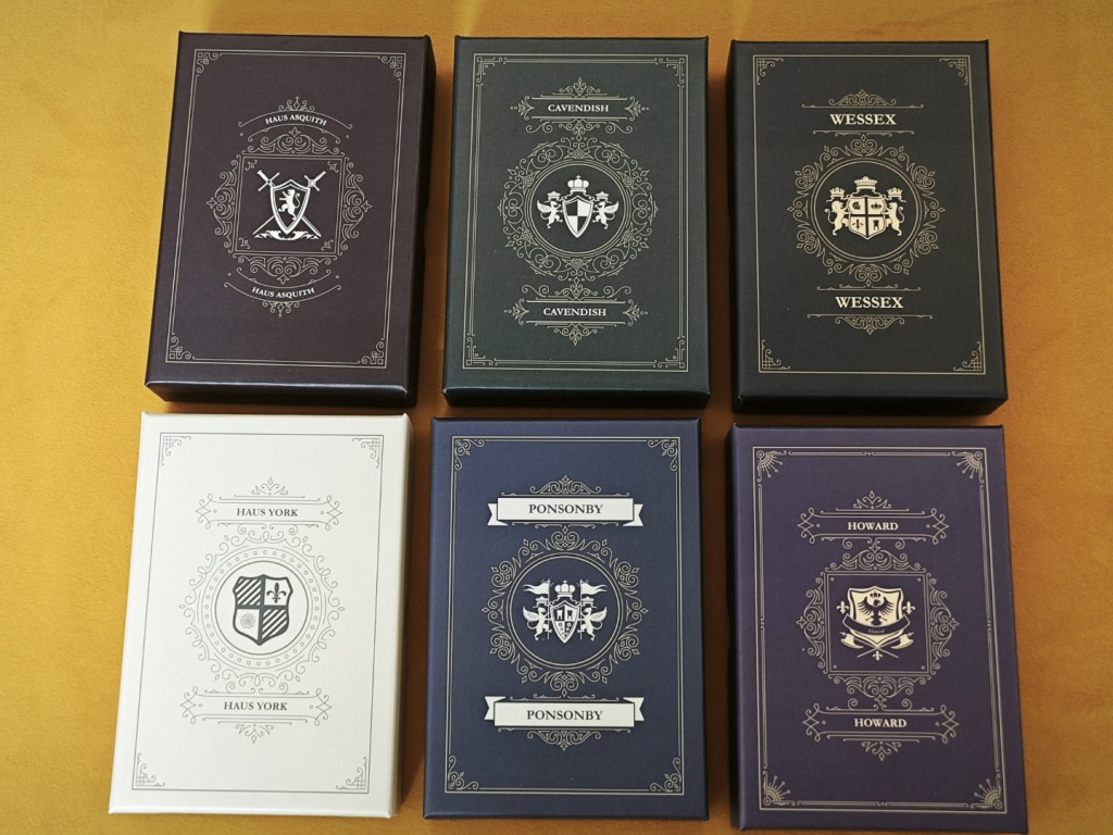 Außerdem gibt es zwei Adelskarten-Decks, eines für Gelegenheits-Gäste (ein Lilien-Symbol in oberer linker Ecke) und eines für Prestige-Gäste (2 Lilien-Symbole in oberer linker Ecke). Das Deck der Gelegenheits-Gäste beinhaltet auch die übrigen der 15 Start-Gelegenheitsgäste (Kronen-Symbol), die von keiner Familie gewählt wurden. Alle Gast-Karten können im Spielverlauf ins eigene Deck integriert werden, wobei die Prestige-Gäste größere Anforderungen an das Ansehen der eigenen Familie stellen, aber dafür beim Ausspielen auch bessere Gefälligkeiten geben.